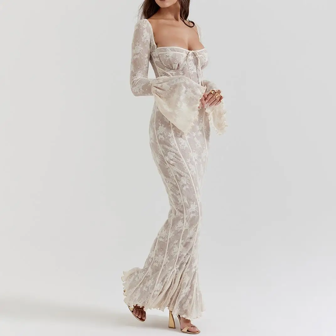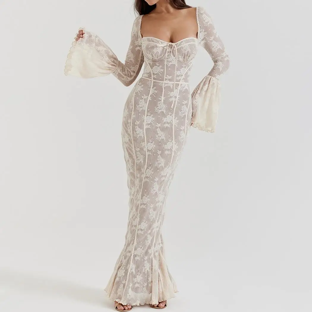 Wholesale OEM Premium Floral Lace Long Flare Sleeve Mermaid Sexy Evening Gown Women's Club Party Casual Maxi Dress