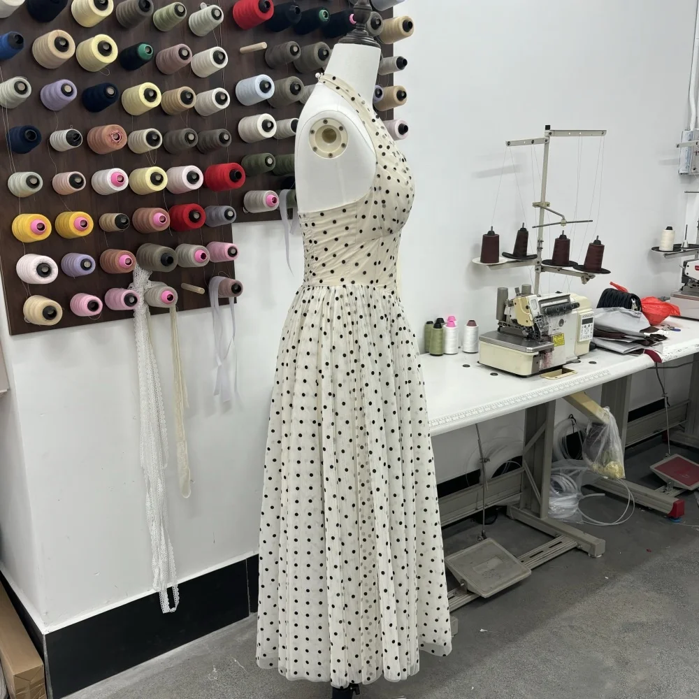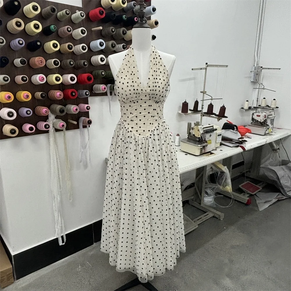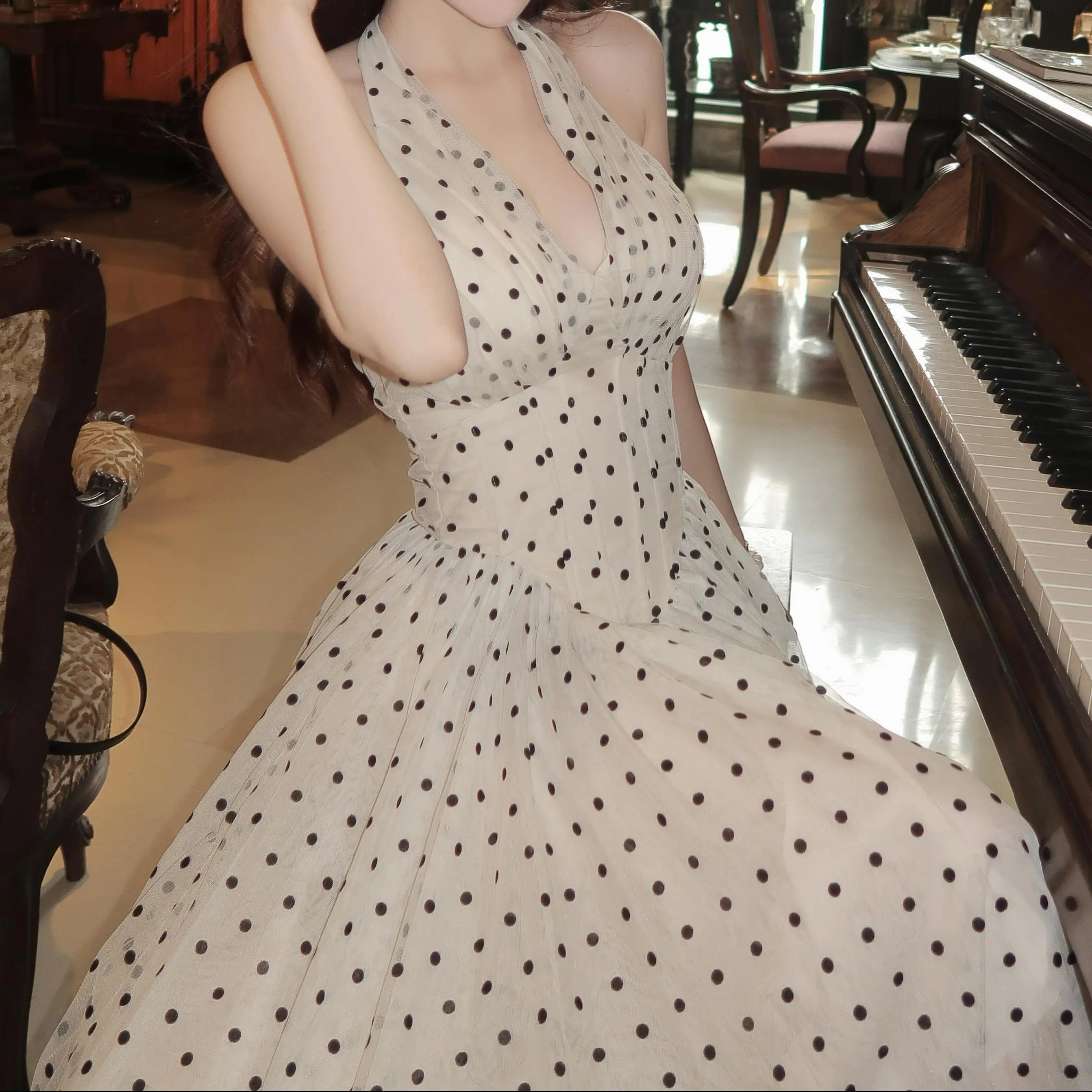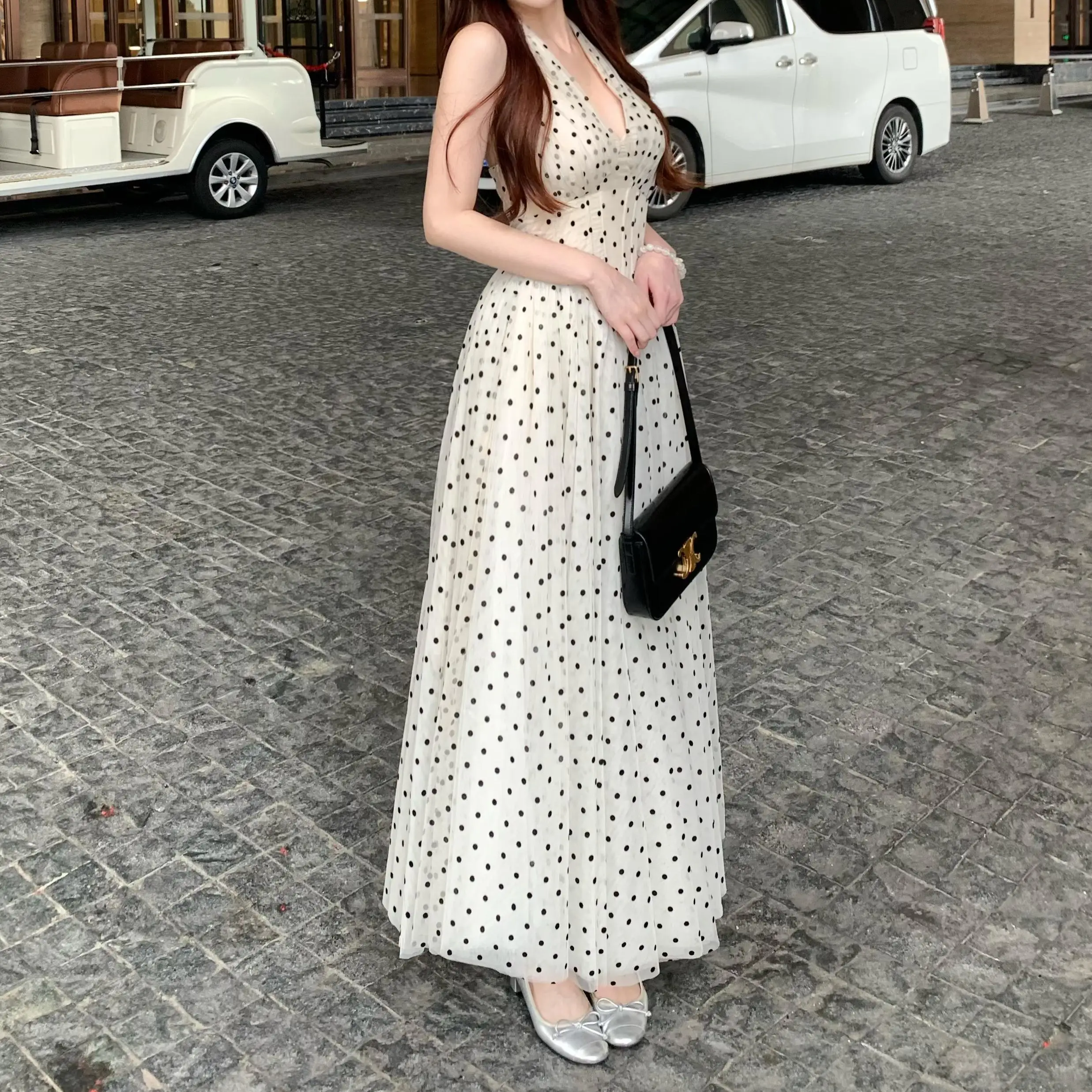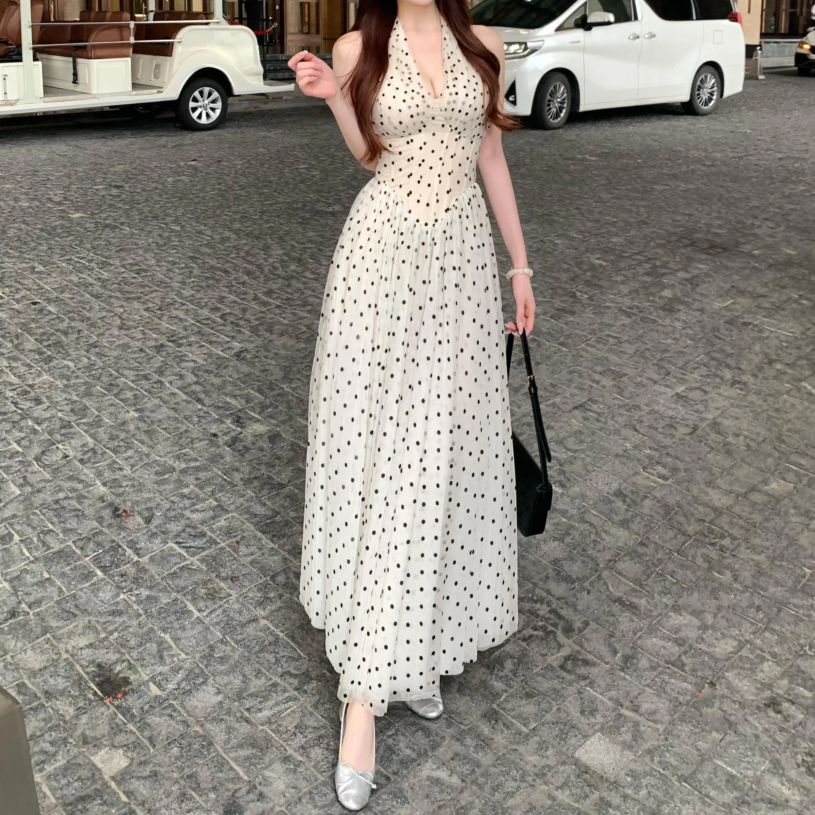 Polka Dot Halter Dress Elegant Waist-Cinching Summer Casual Fishbone V-Neck Long Dress with Sexy Backless Maxi Dress