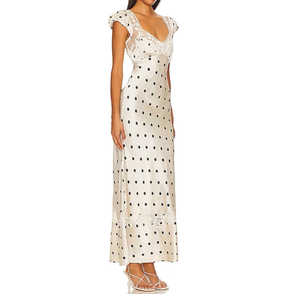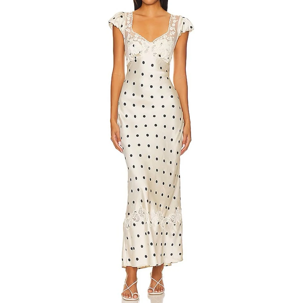 Summer Garden Party Polka Dot Maxi Dress Delicate Lace Trim Sexy Elegant Vintage Casual Dress Women Ladies
