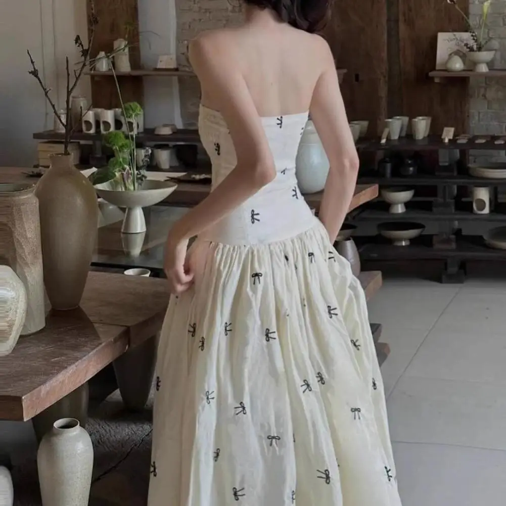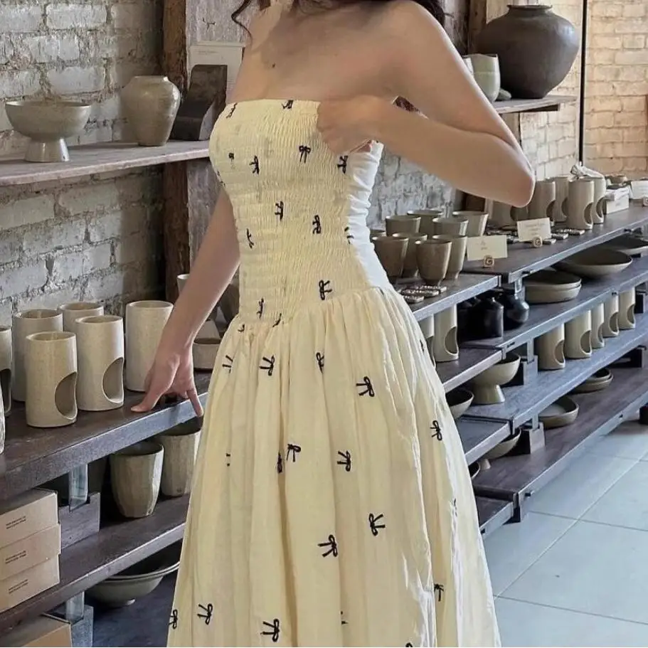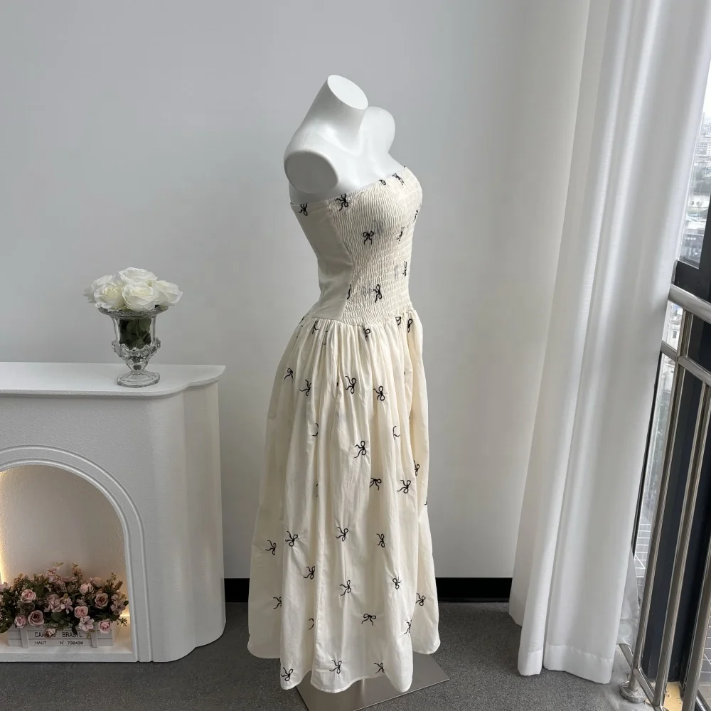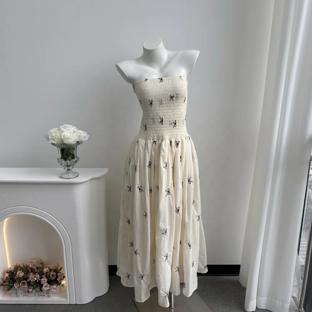 Elegant Fashion Embroidered Bow Hidden Pocket Smocked Strapless Maxi Dress Women' Summer Outfit for Vacation Party