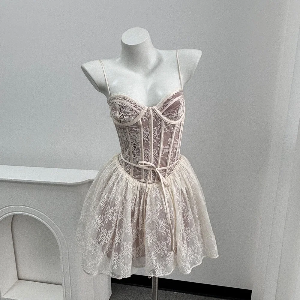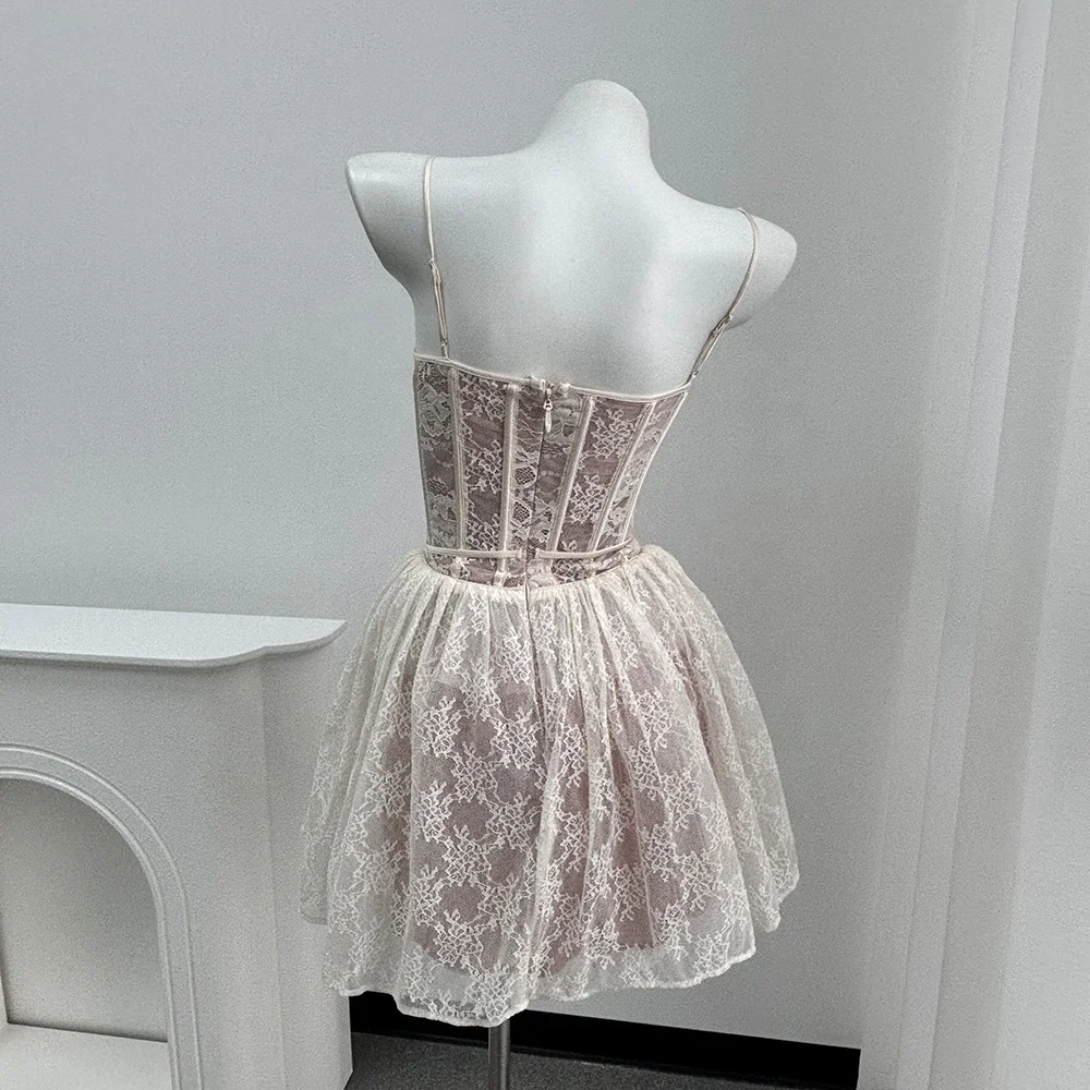 New Design Floral Lace Halter Solid Color Party Dress Sexy Backless Slim Fish Bone Short White Women Mini Dress