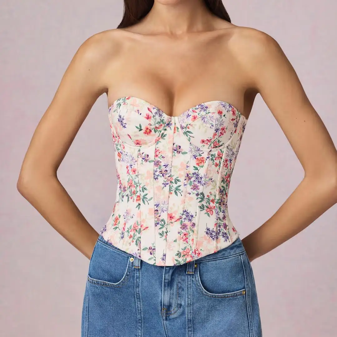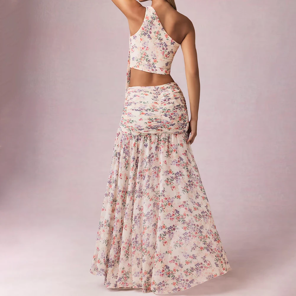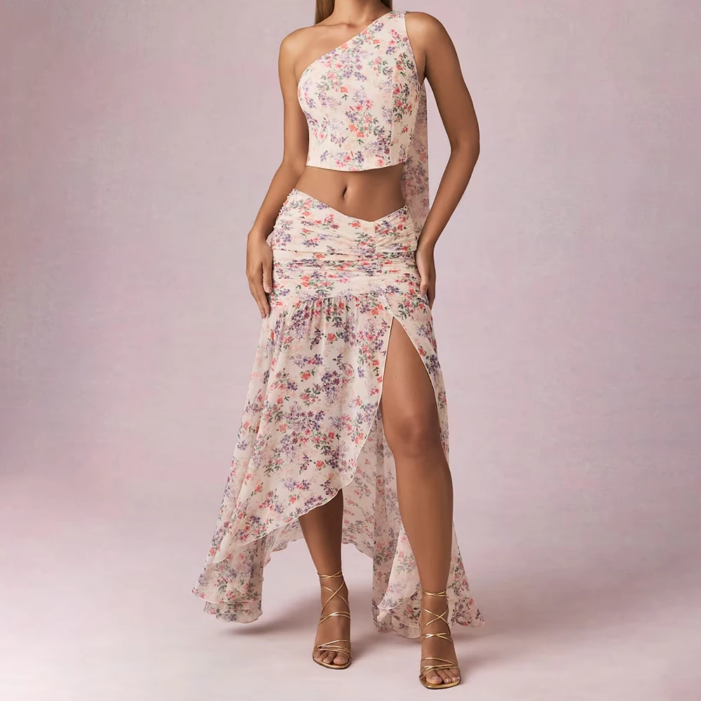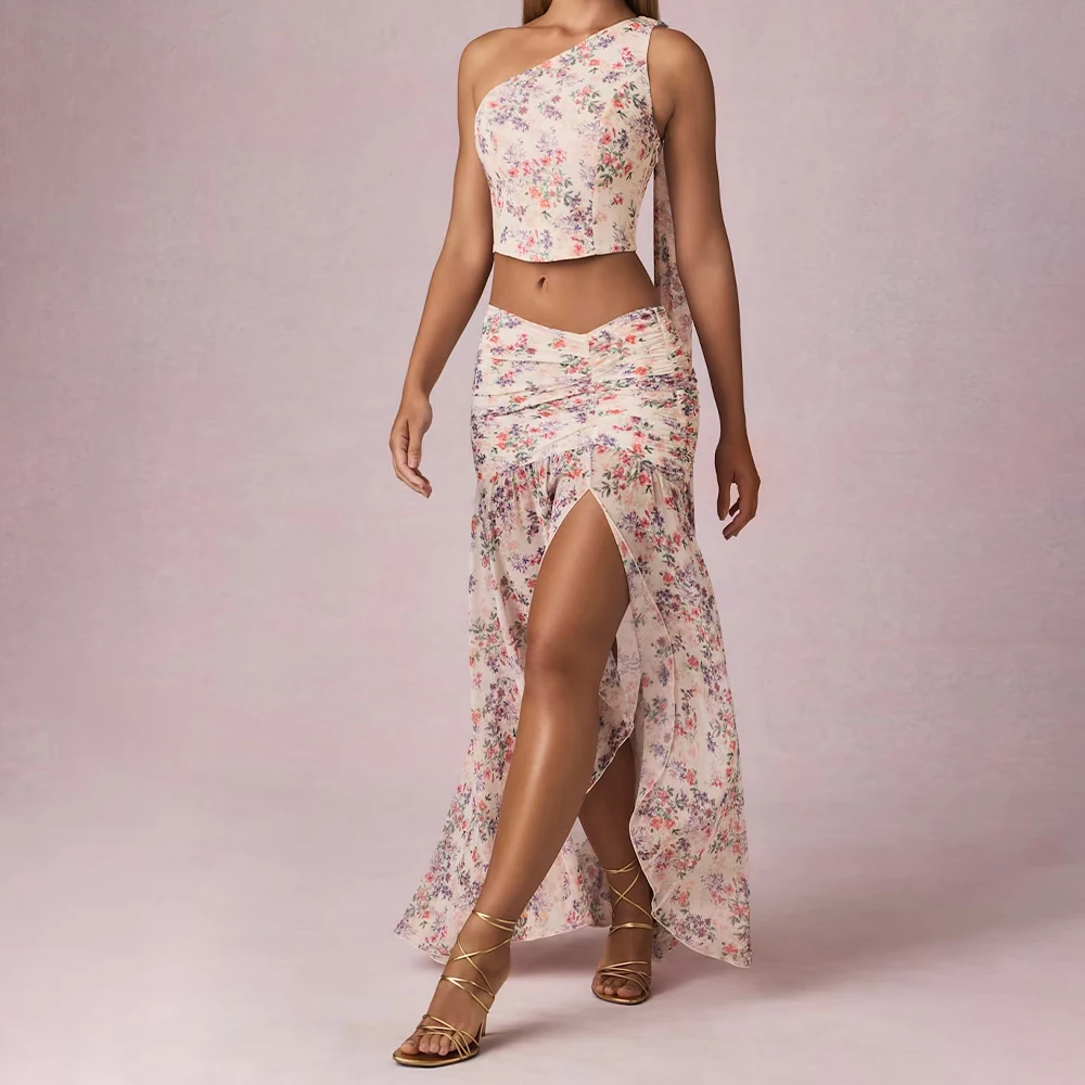 Sexy Women Three Piece Floral Print Bodycon Skirt with High Slit Asymmetric & Strapless Lace-up Top Bandage Dress for Party