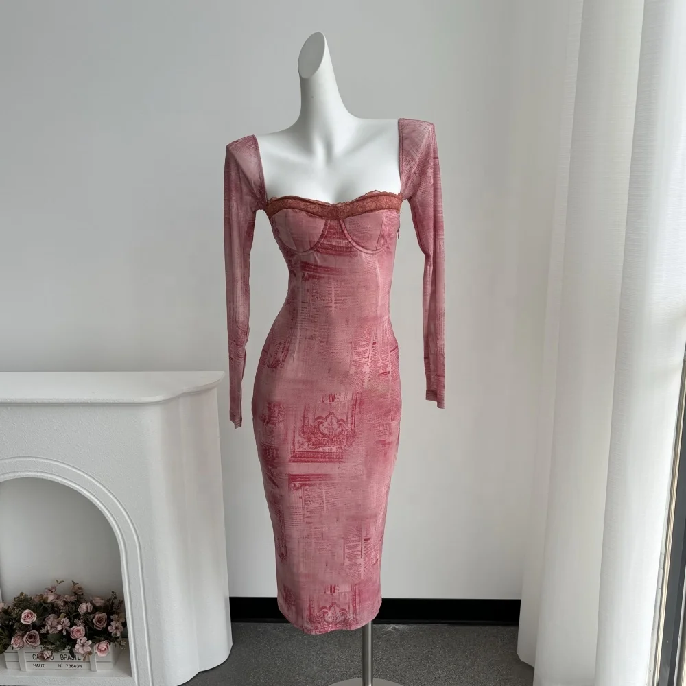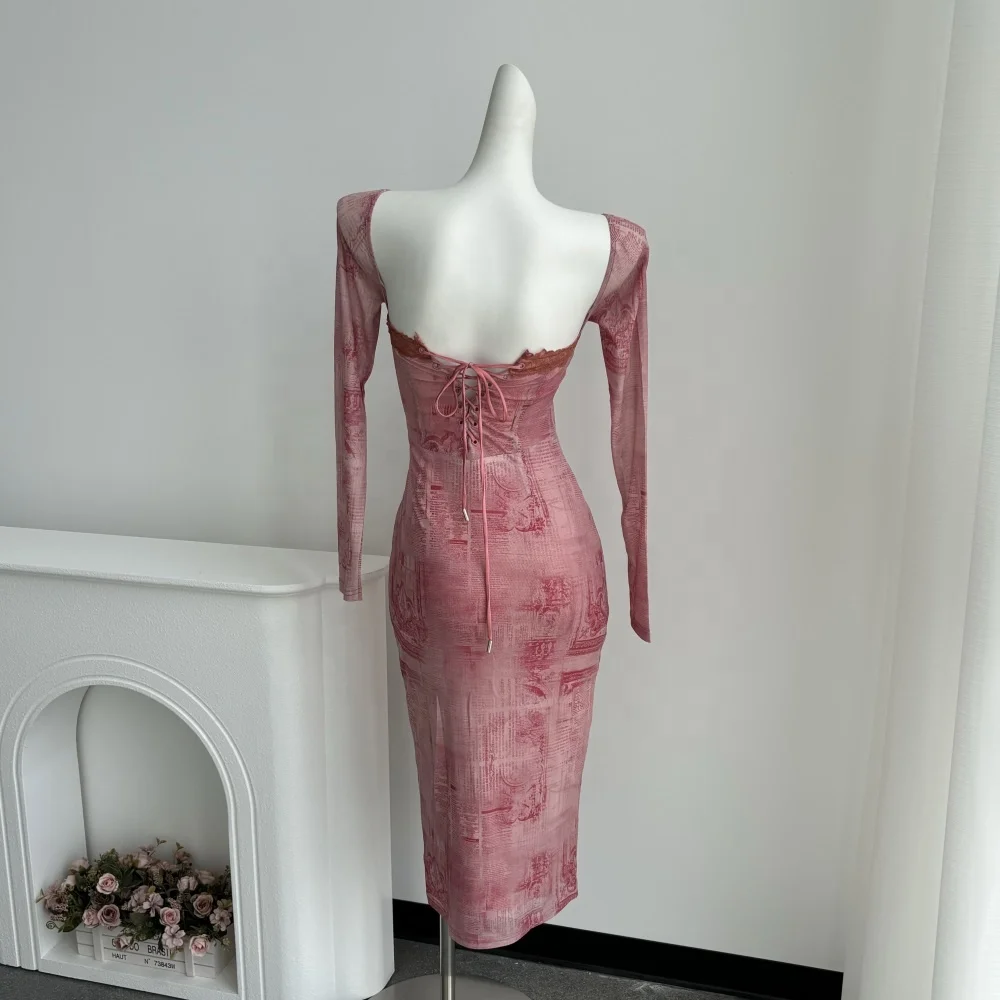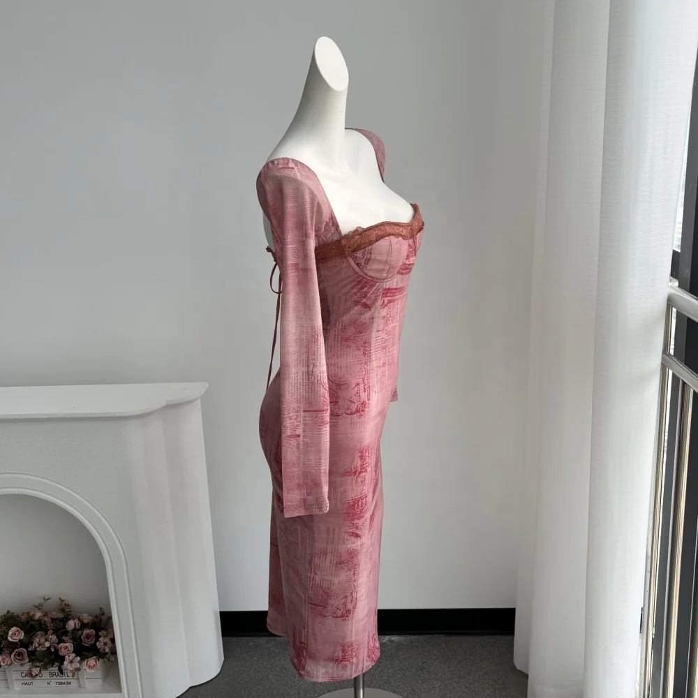 Trending Patchwork Long Sleeve Square Neck Sexy Casual Elegant Retro Print Bodycon Midi Dress with Lace-Up for Daily Club