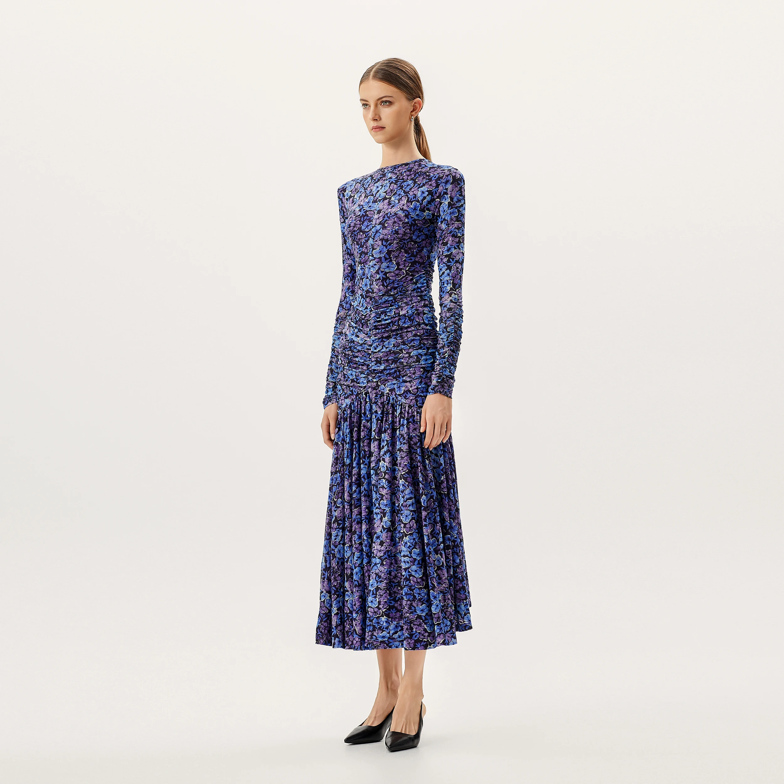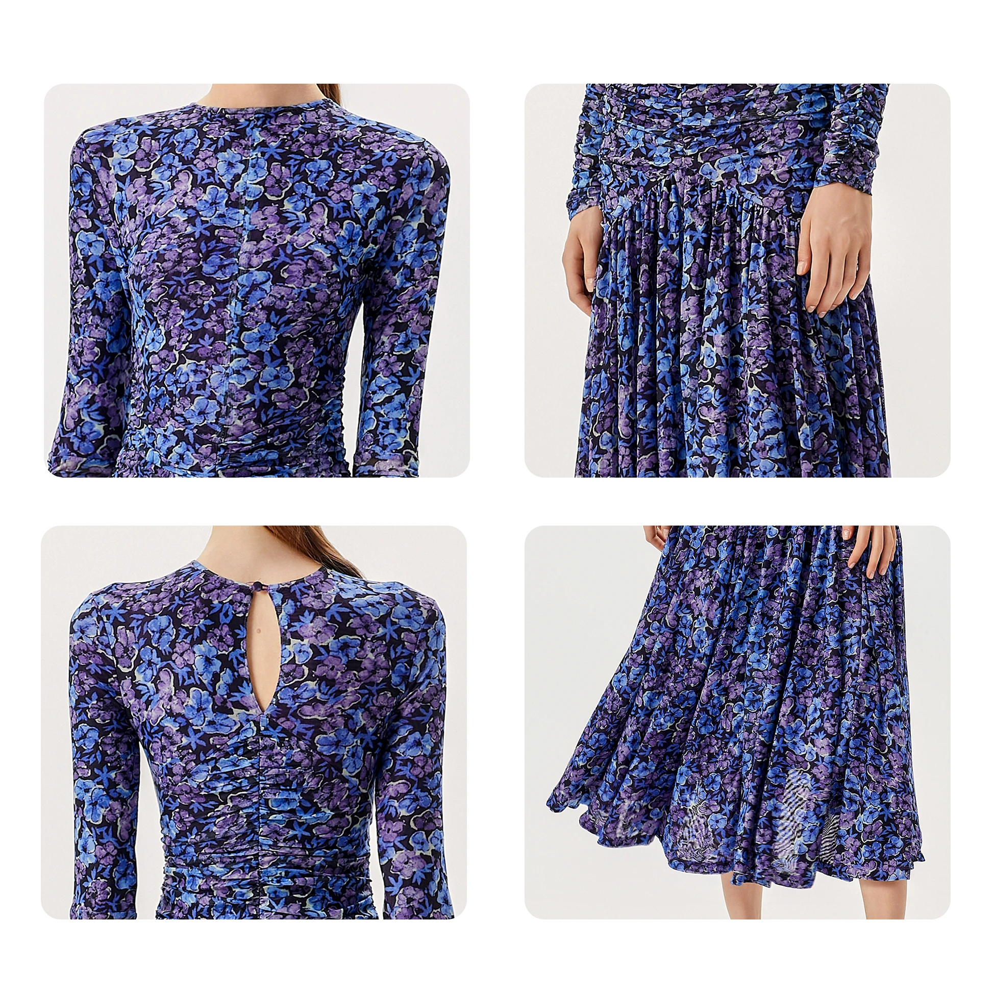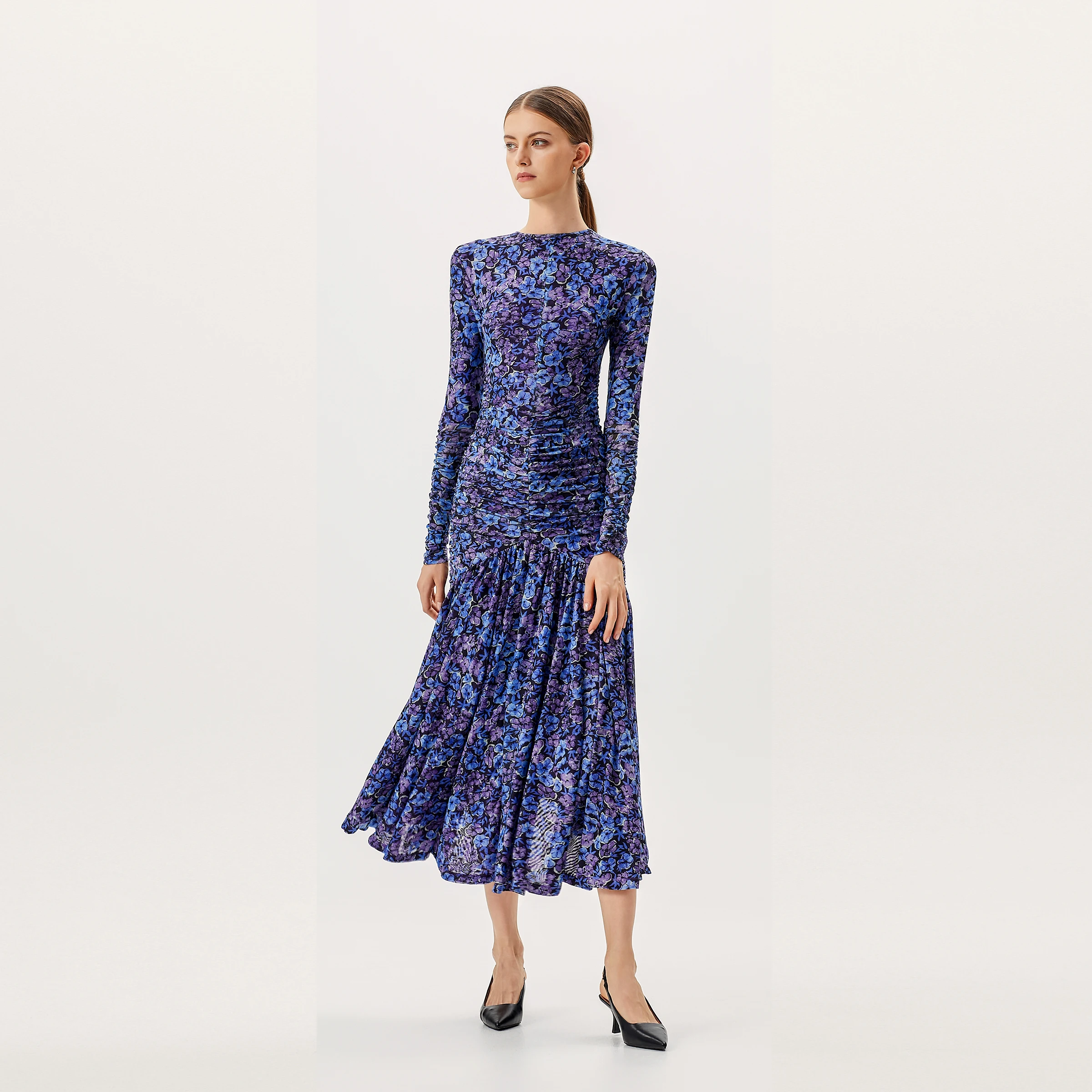 ZYHT 21541 Wholesale Crew Neck High Waist Casual Dresses Elegant Lace Velvet Mermaid Hem Ruched Long Sleeve Dresses for Women