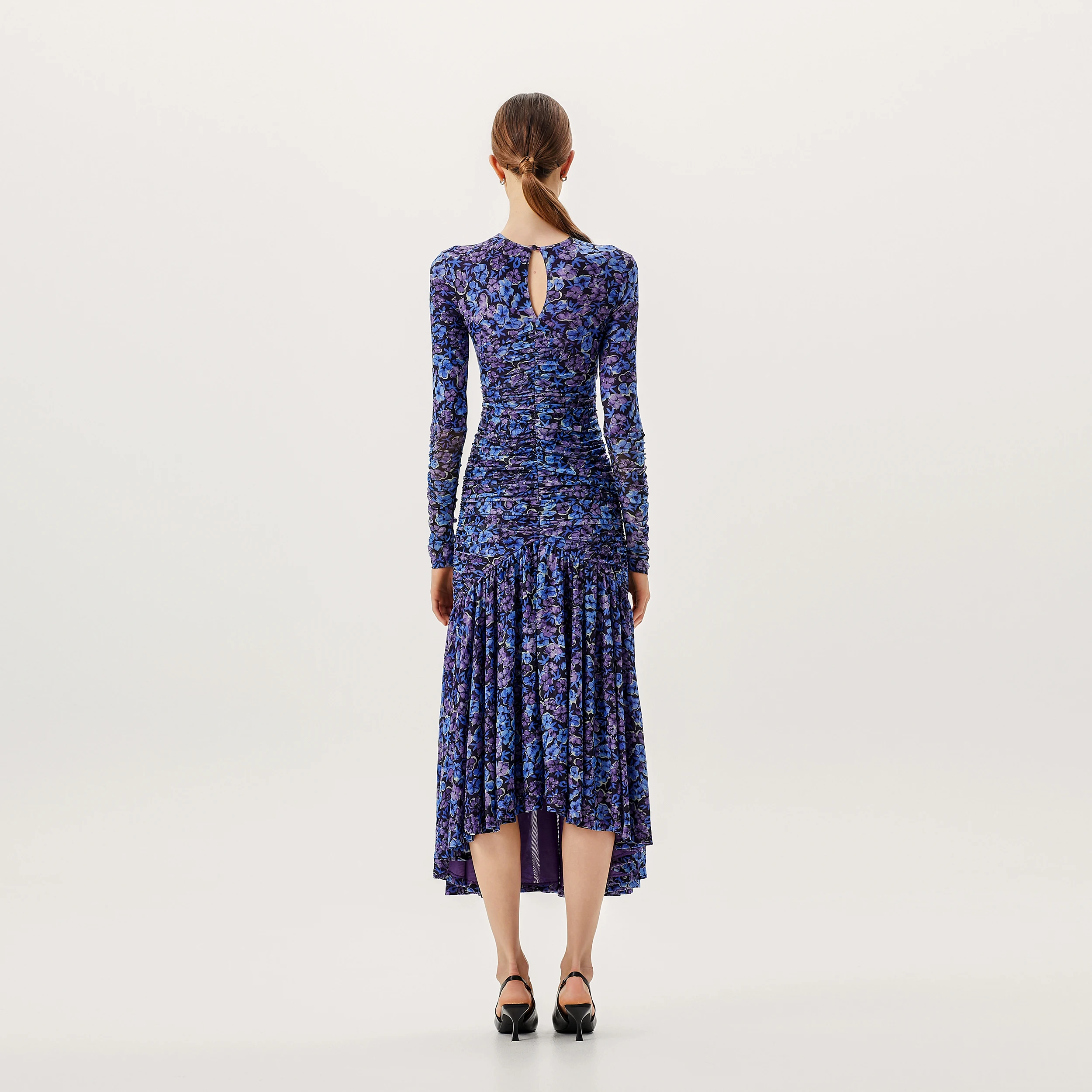 ZYHT 73963 Matte Satin Printed Geometric Pattern Maxi Women Asymmetric One Shoulder Ruched Hem Women Dress