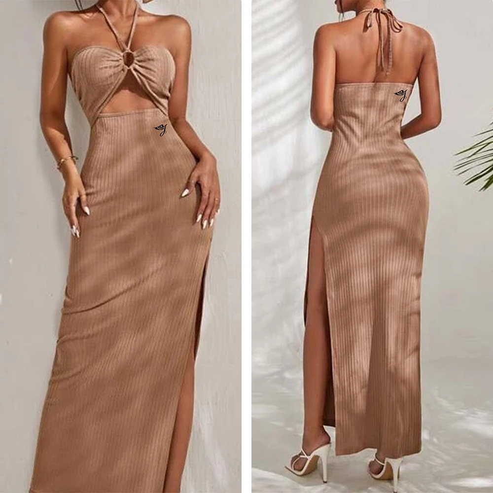 OEM Custom Ribbed Maxi Party Camisole Dresses for Women Beige Halter Lady Elegant Slit Ring Cutout Bodycon Long Casual Dress