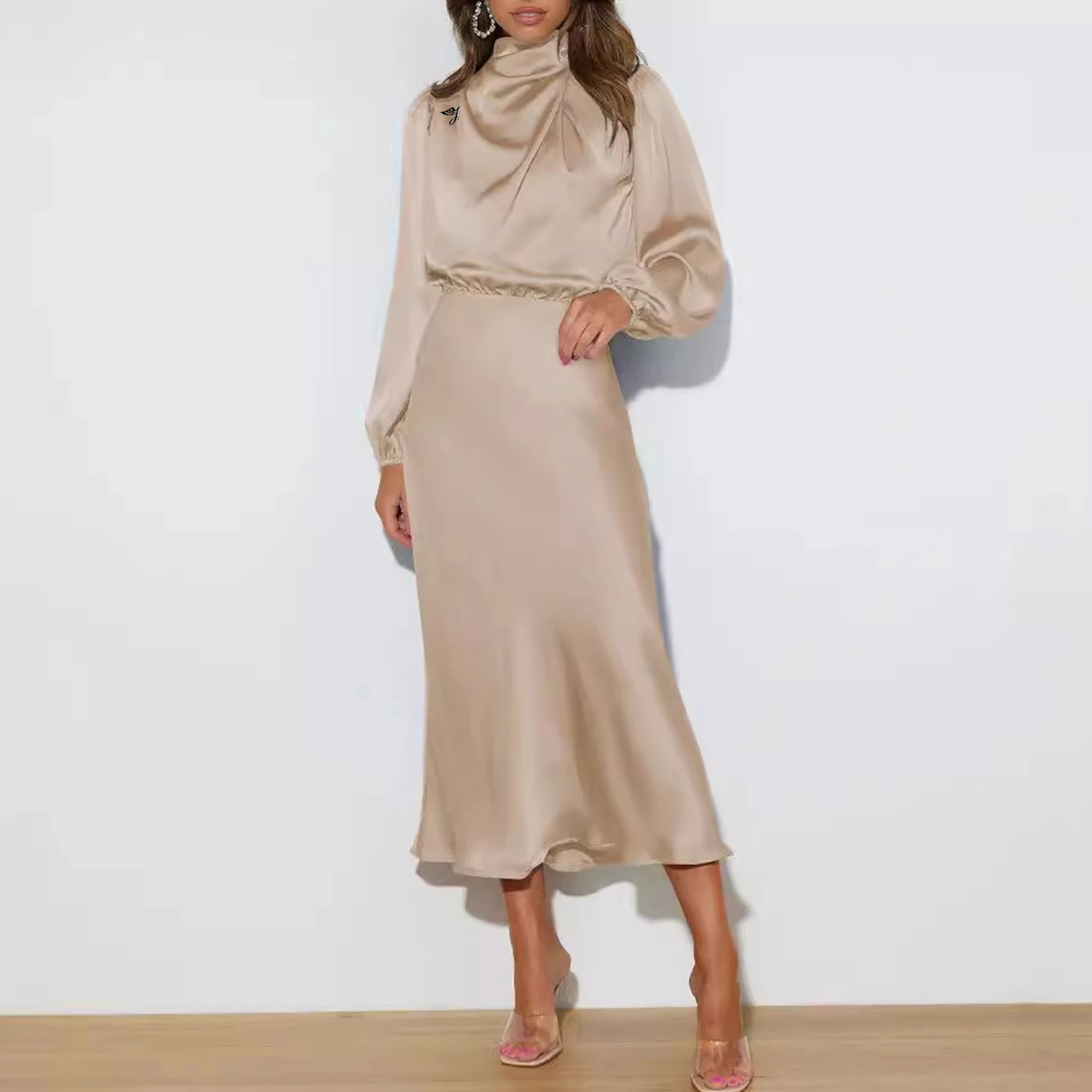 Guangzhou Garment Manufacture OEM Custom Long Lantern Sleeves Satin Evening Dresses Women Maxi Elegant Dress