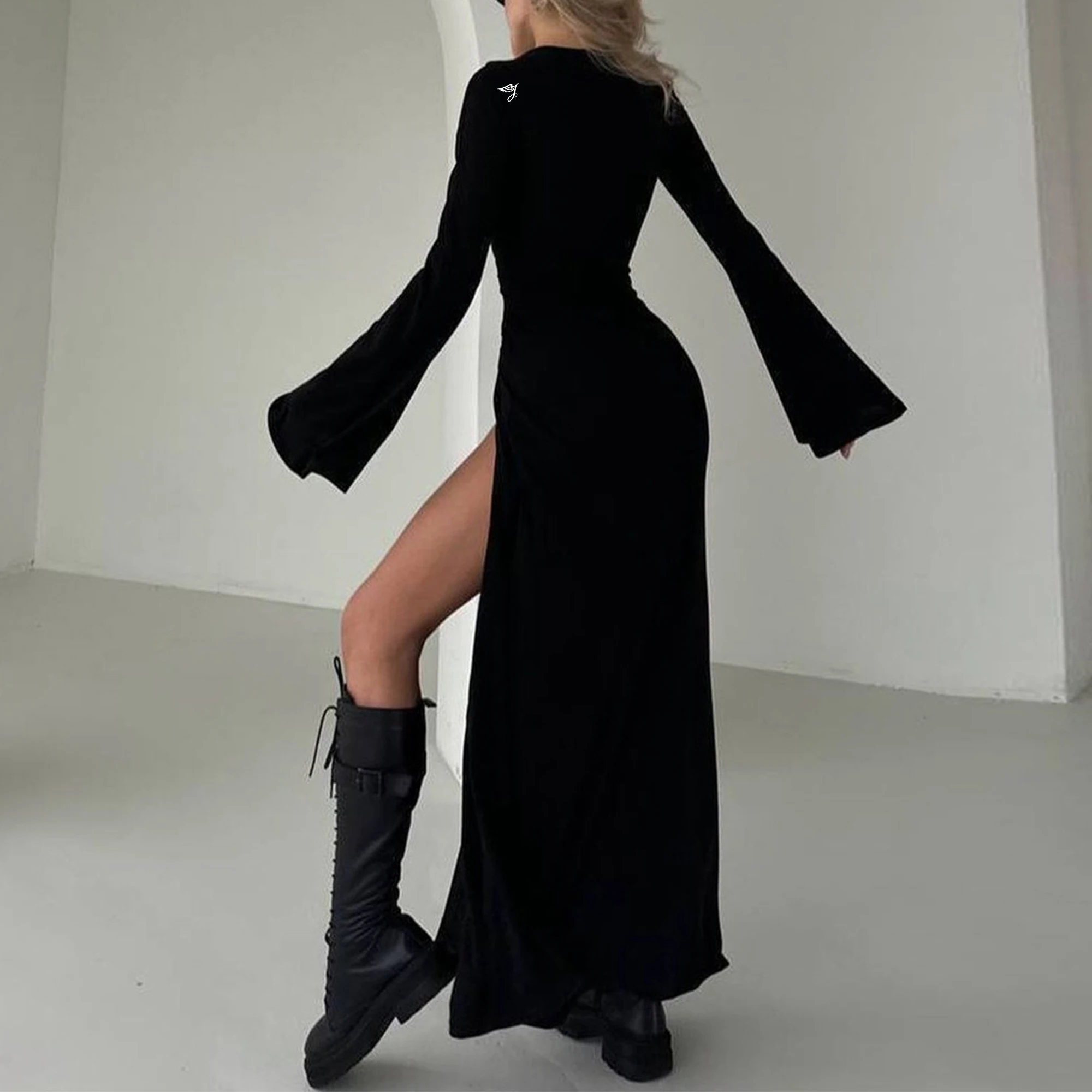 Wholesale Custom Round Neck Long Sleeve Split Fashion Stylish Black Modest Women Evening Gown Dress Black Stylish