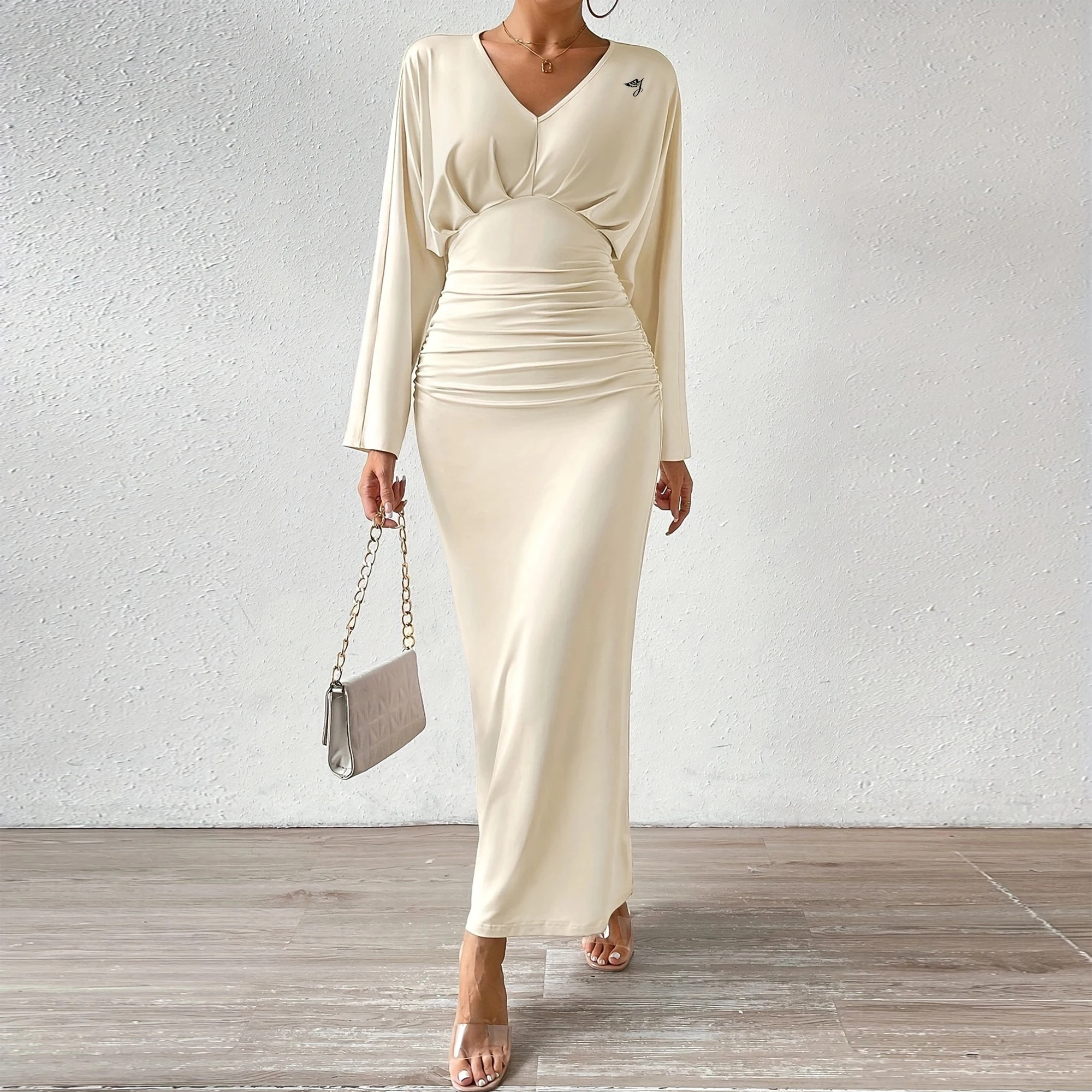 OEM ODM European American V Neck Long Sleeved Evening Solid Color White Engagement Evening Dresses Elegant