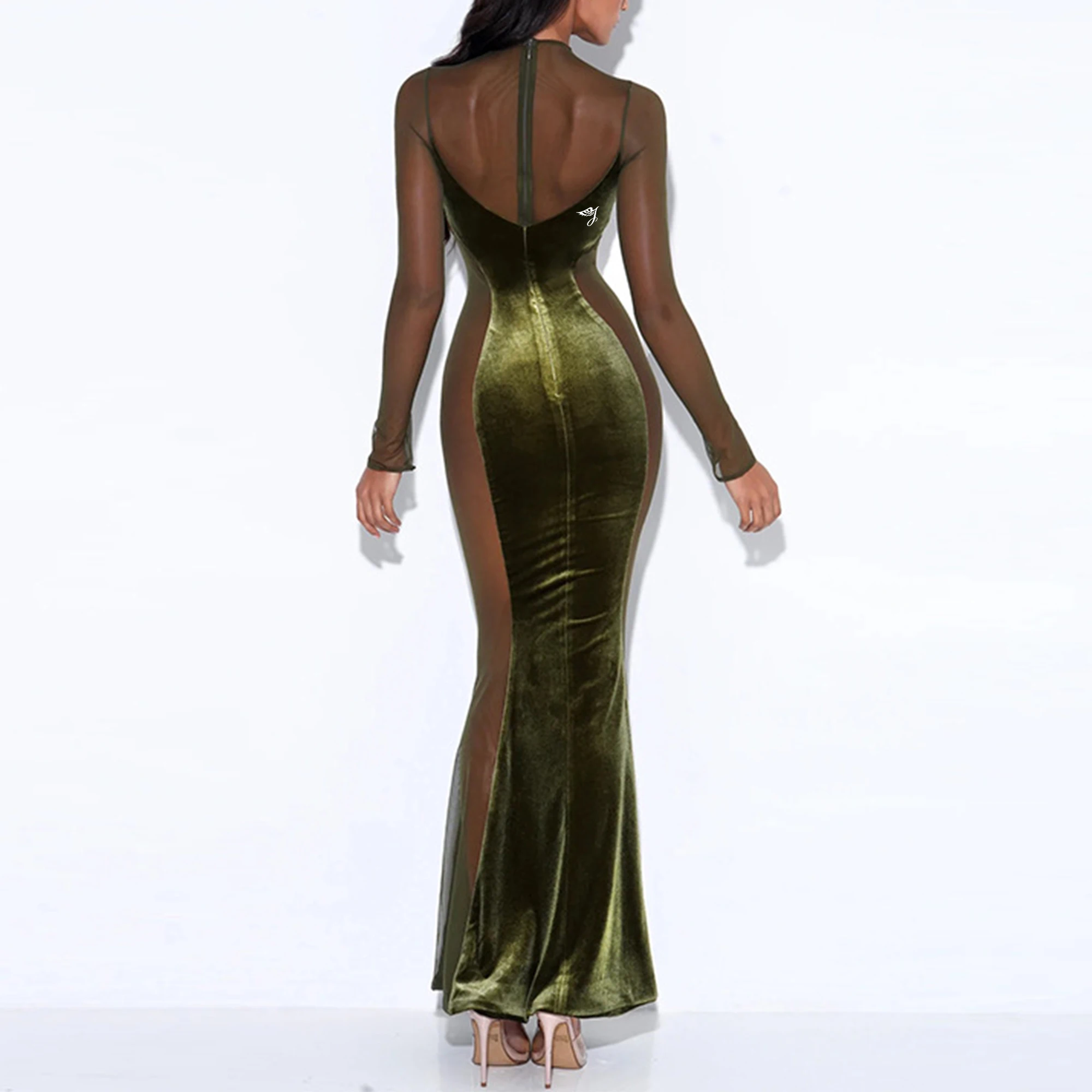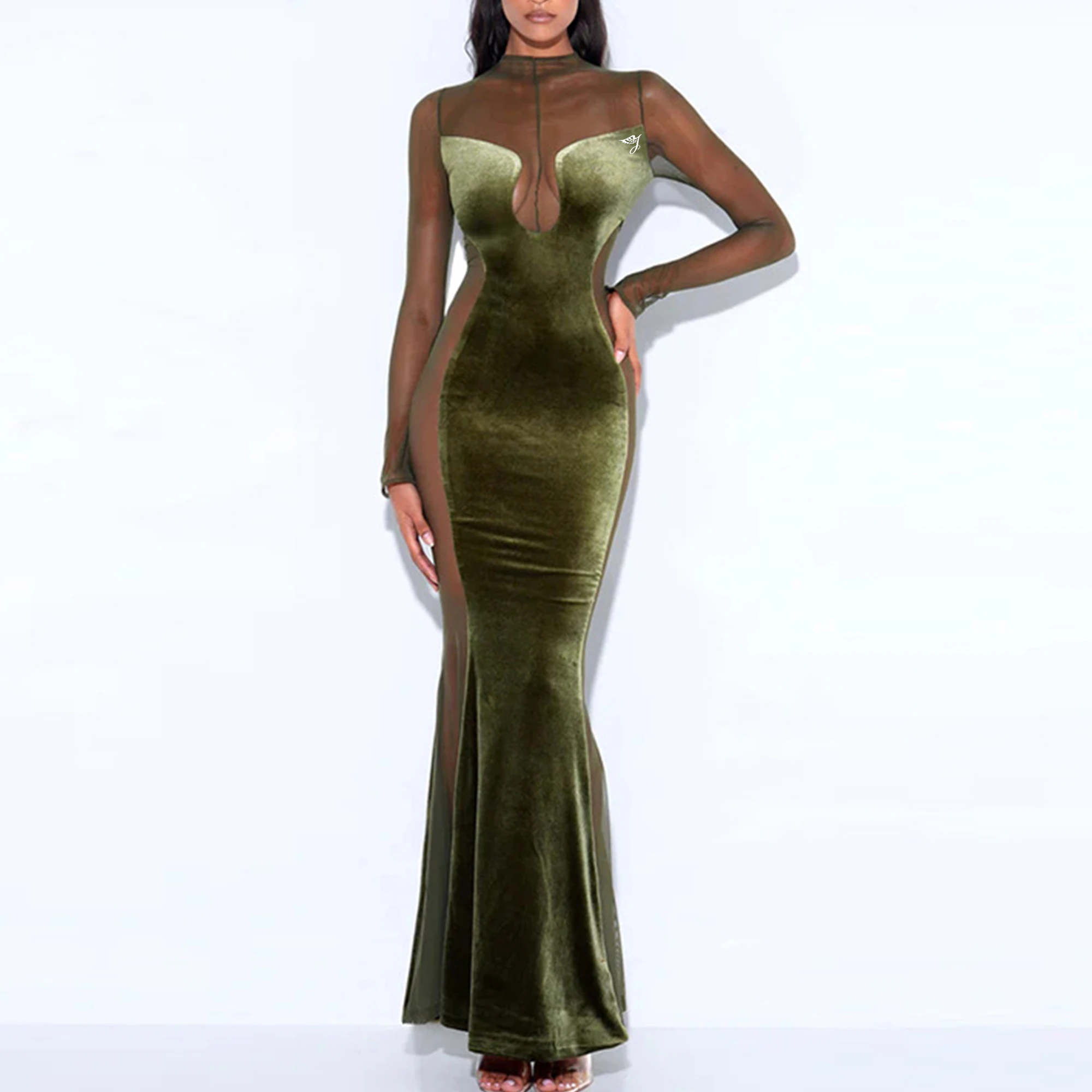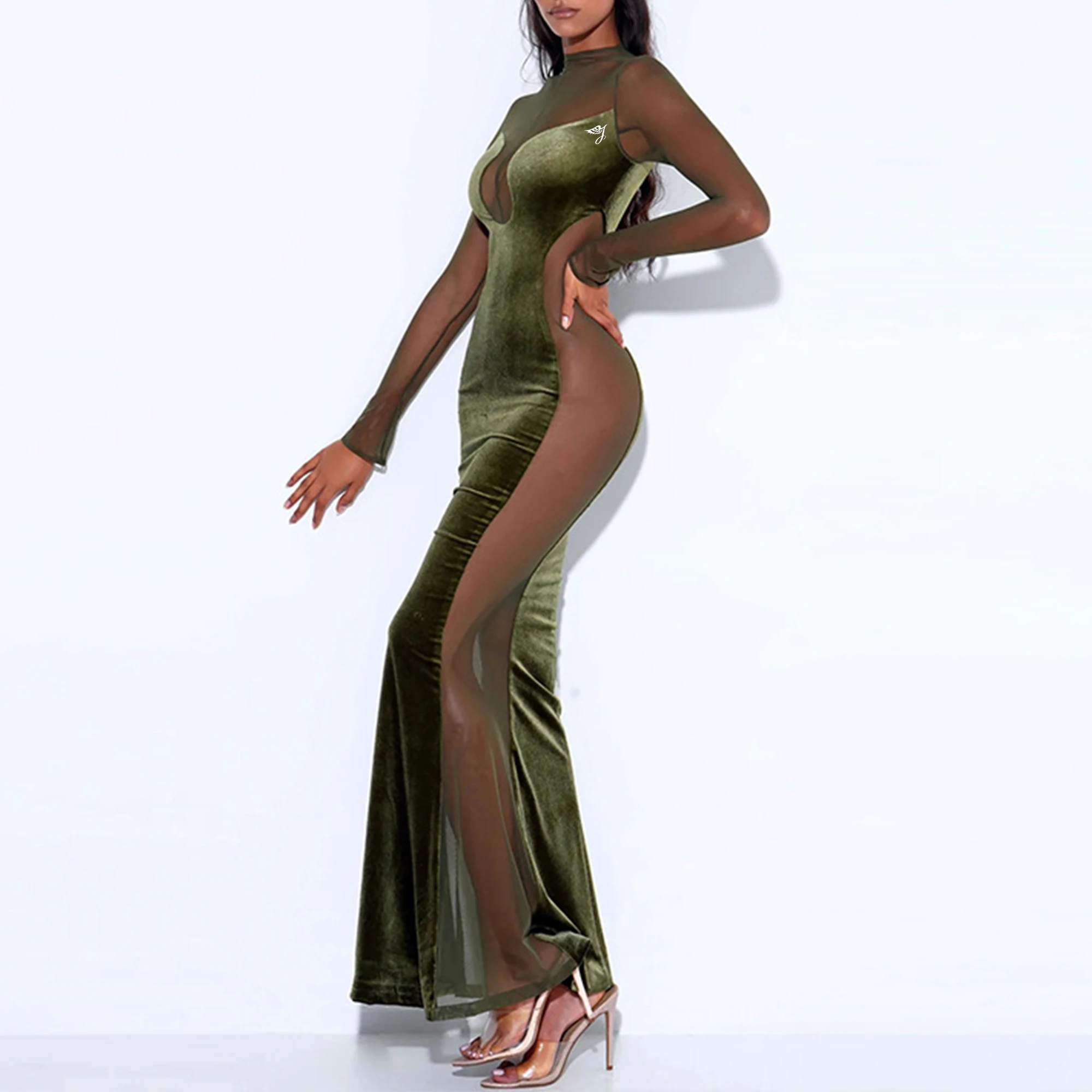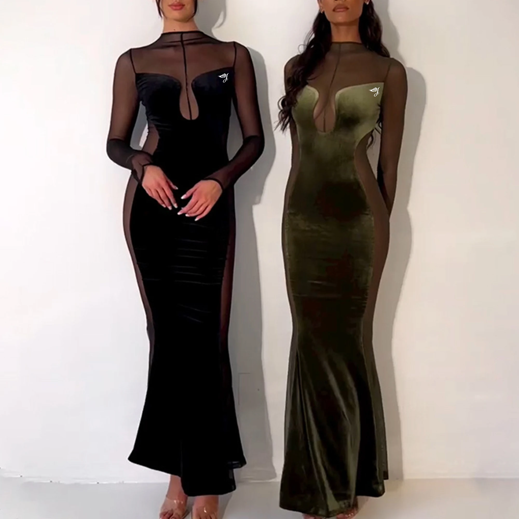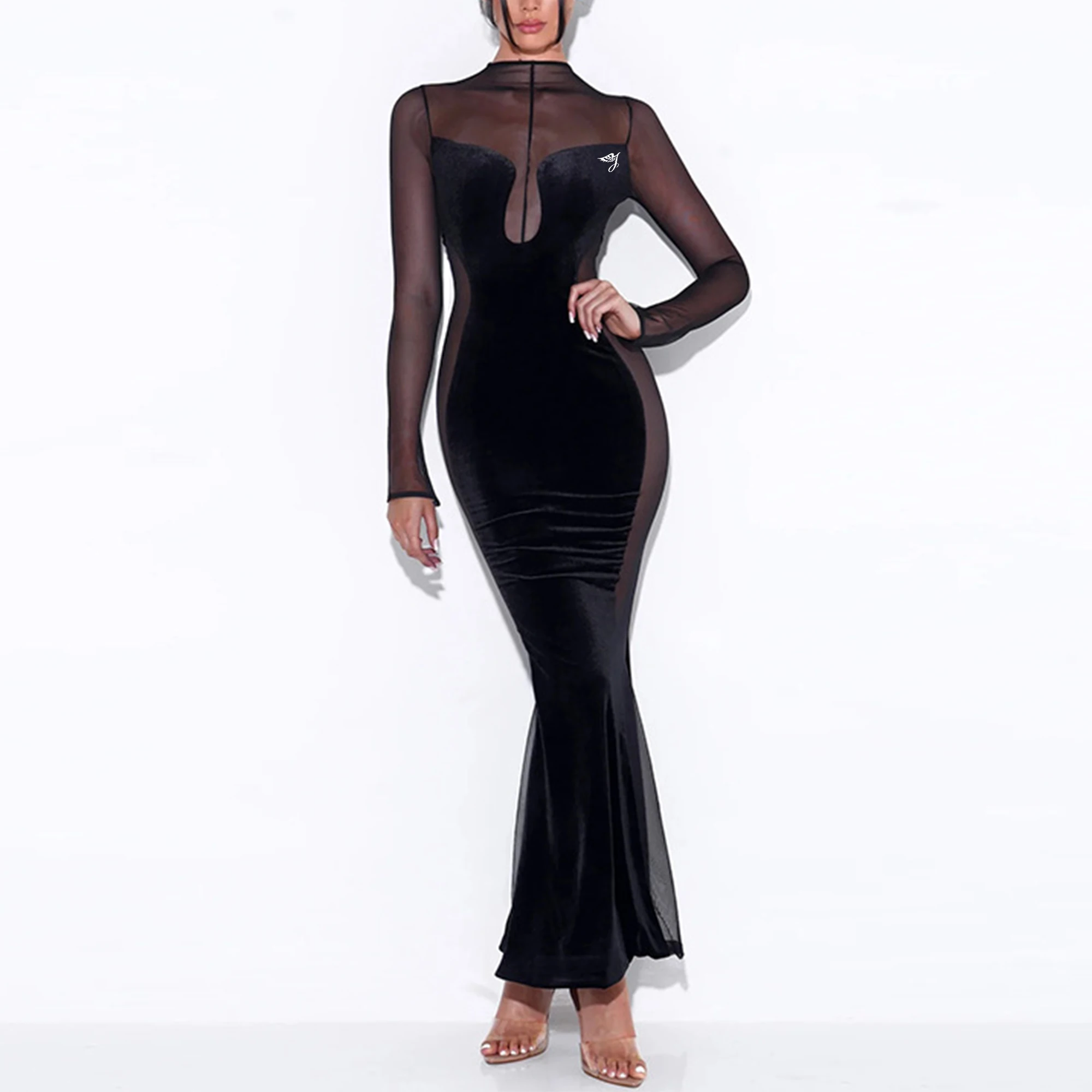 Spring Autumn New Hot Women's Sexy Hollow Perspective Dress Cross-Border Long Sleeved Neck Backless Velvet Party Dress Women