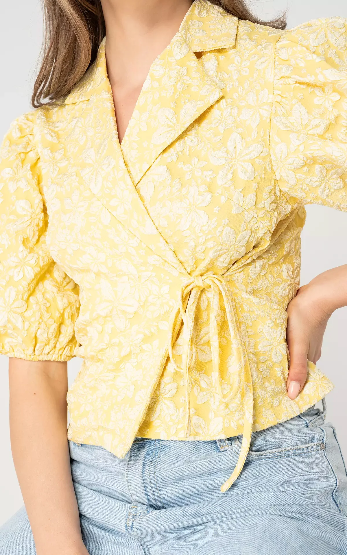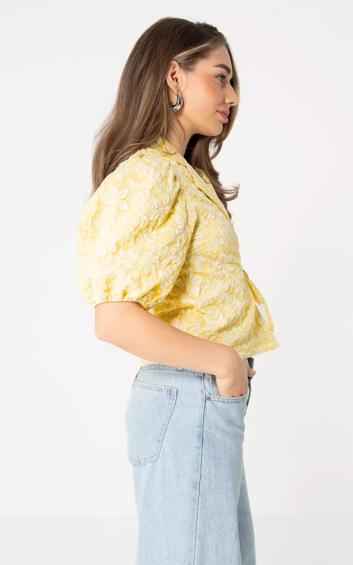 Custom OEM Women's Yellow Jacquard Wrap Crop Top | Puff Sleeve Short Blouse for a Fresh 2026 Spring Look Vintage Casual Shirts