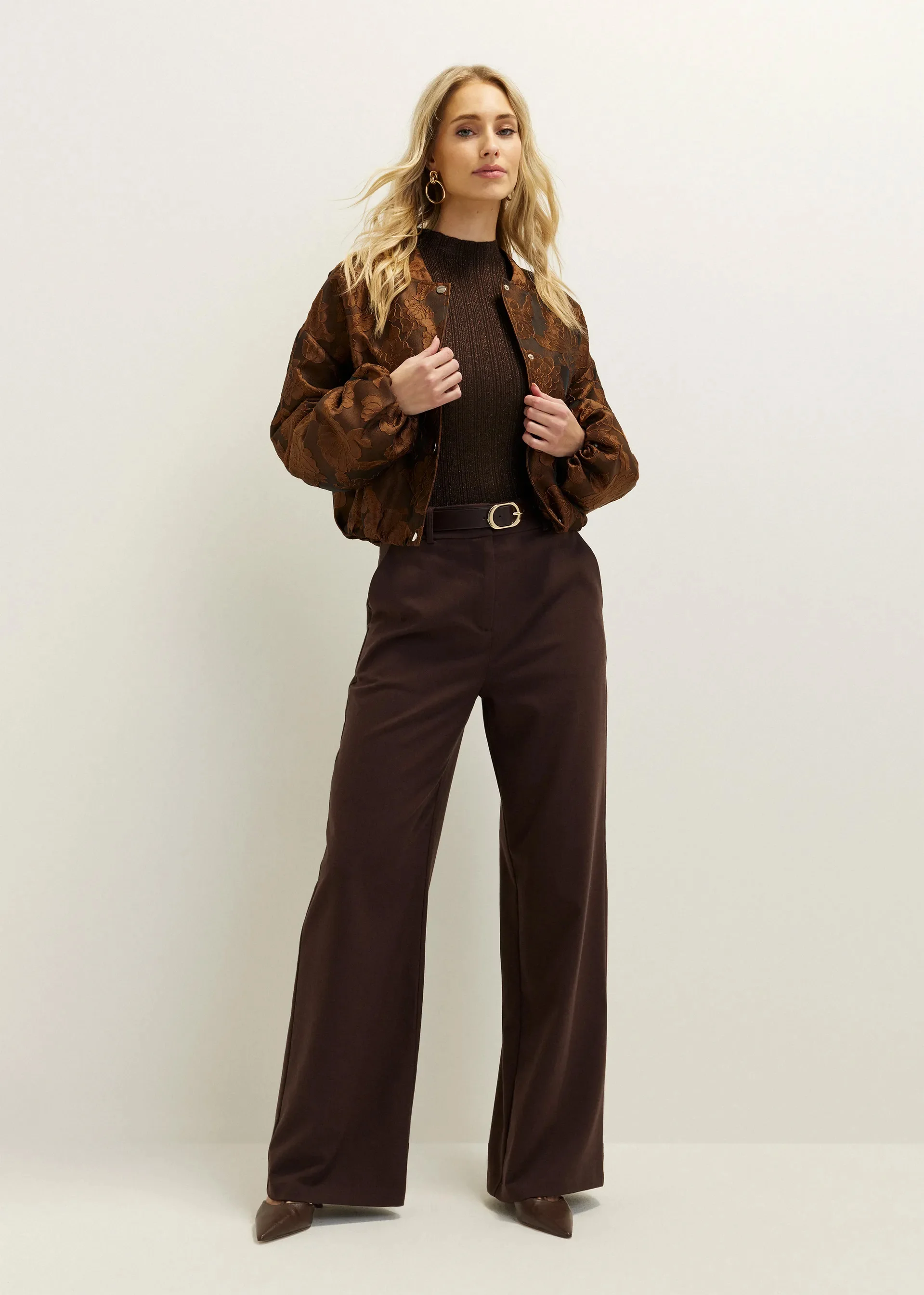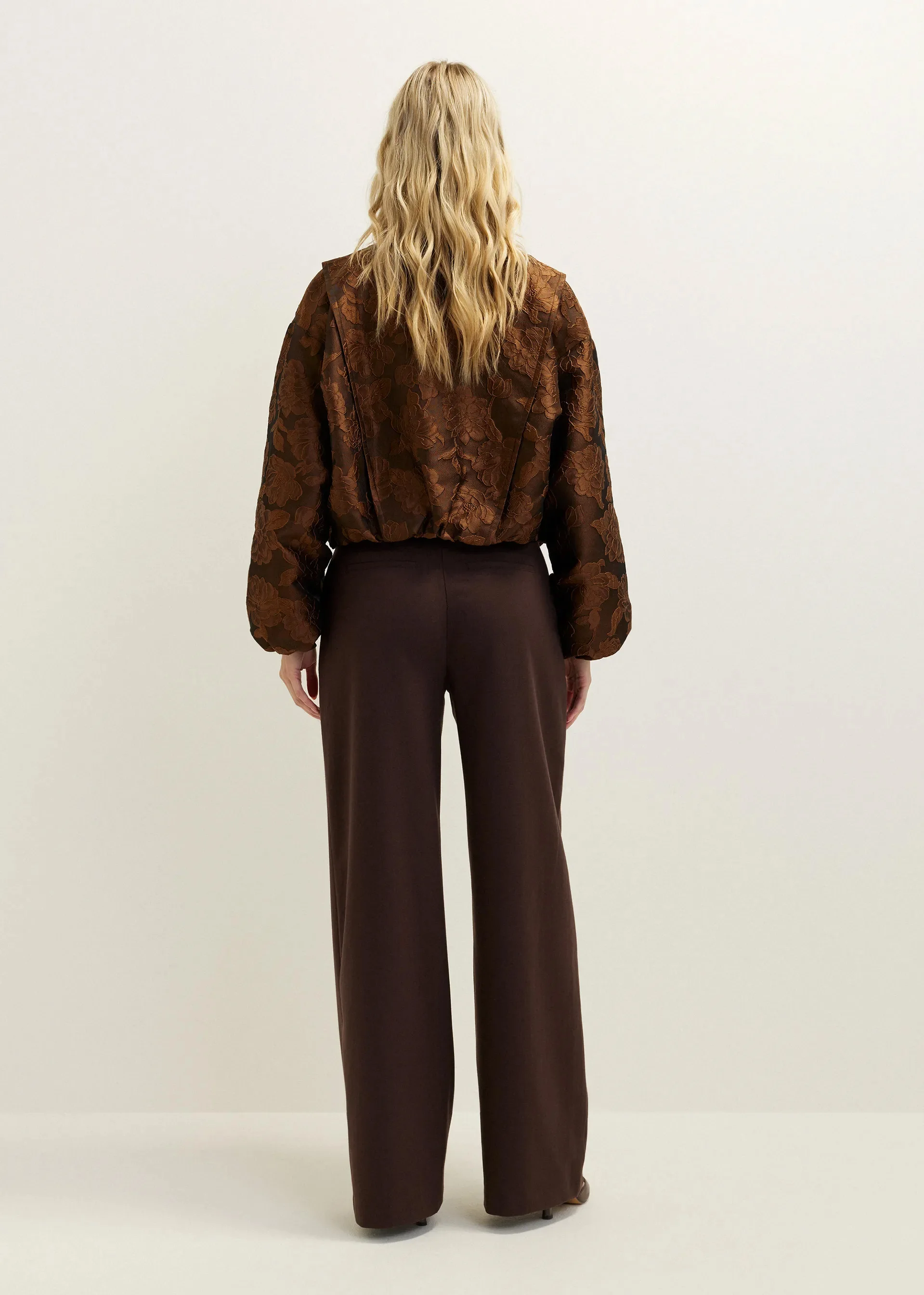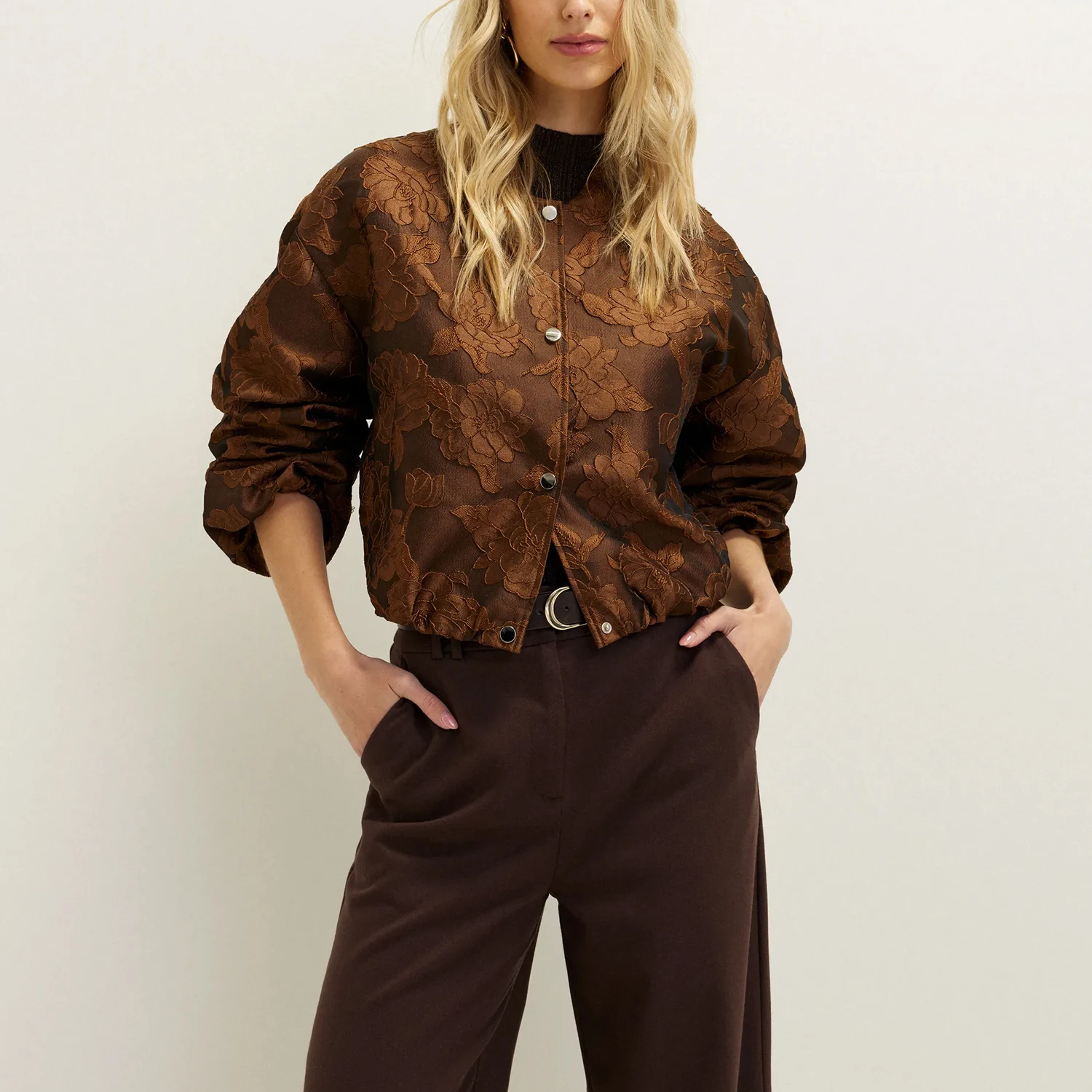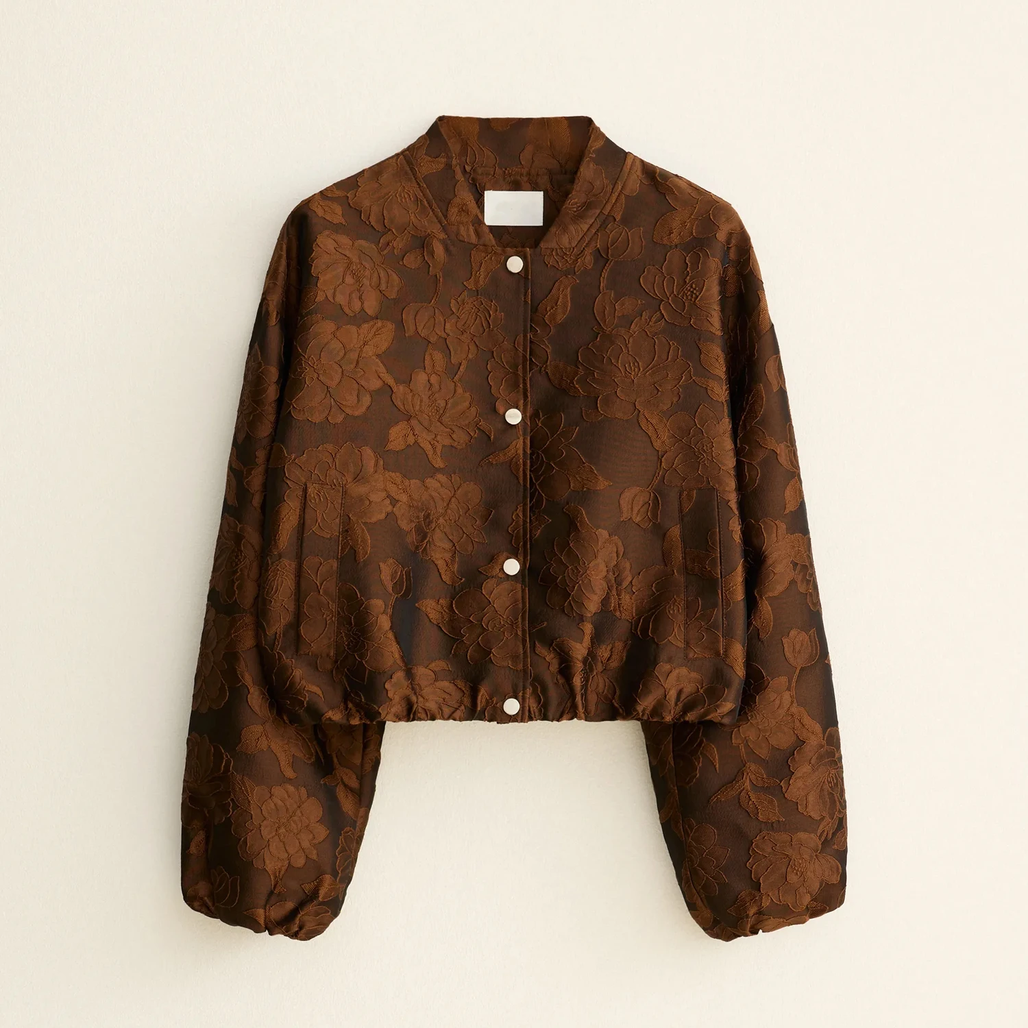 Custom OEM Women's Floral Jacquard Bomber Jacket | Round Neck Relaxed Fit with Button Closure & Elastic Cuffs