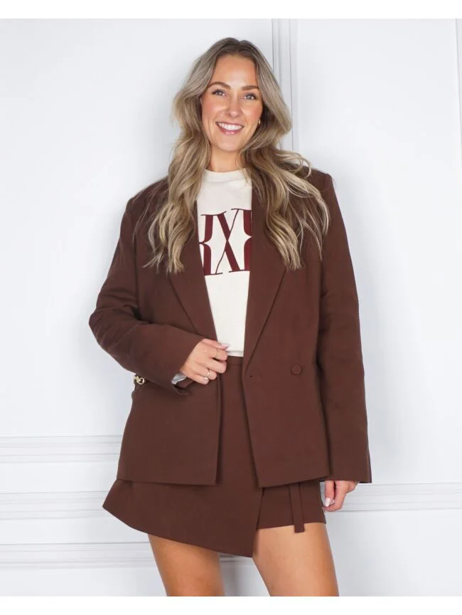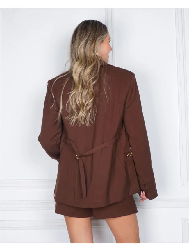 Custom OEM Women's Recycled Polyester Oversized Blazer | Dark Brown Utility Jacket with Detachable Chain & Cinch Belt Pockets