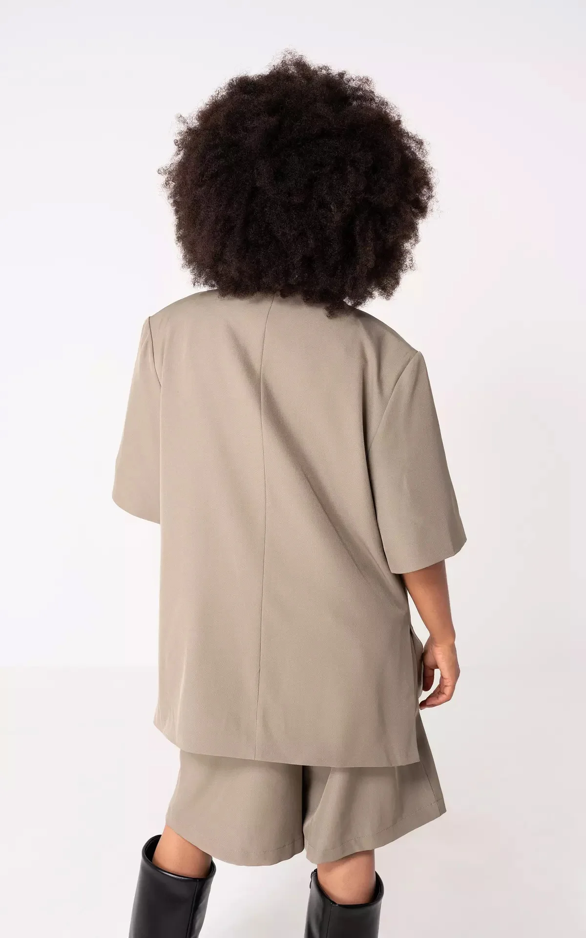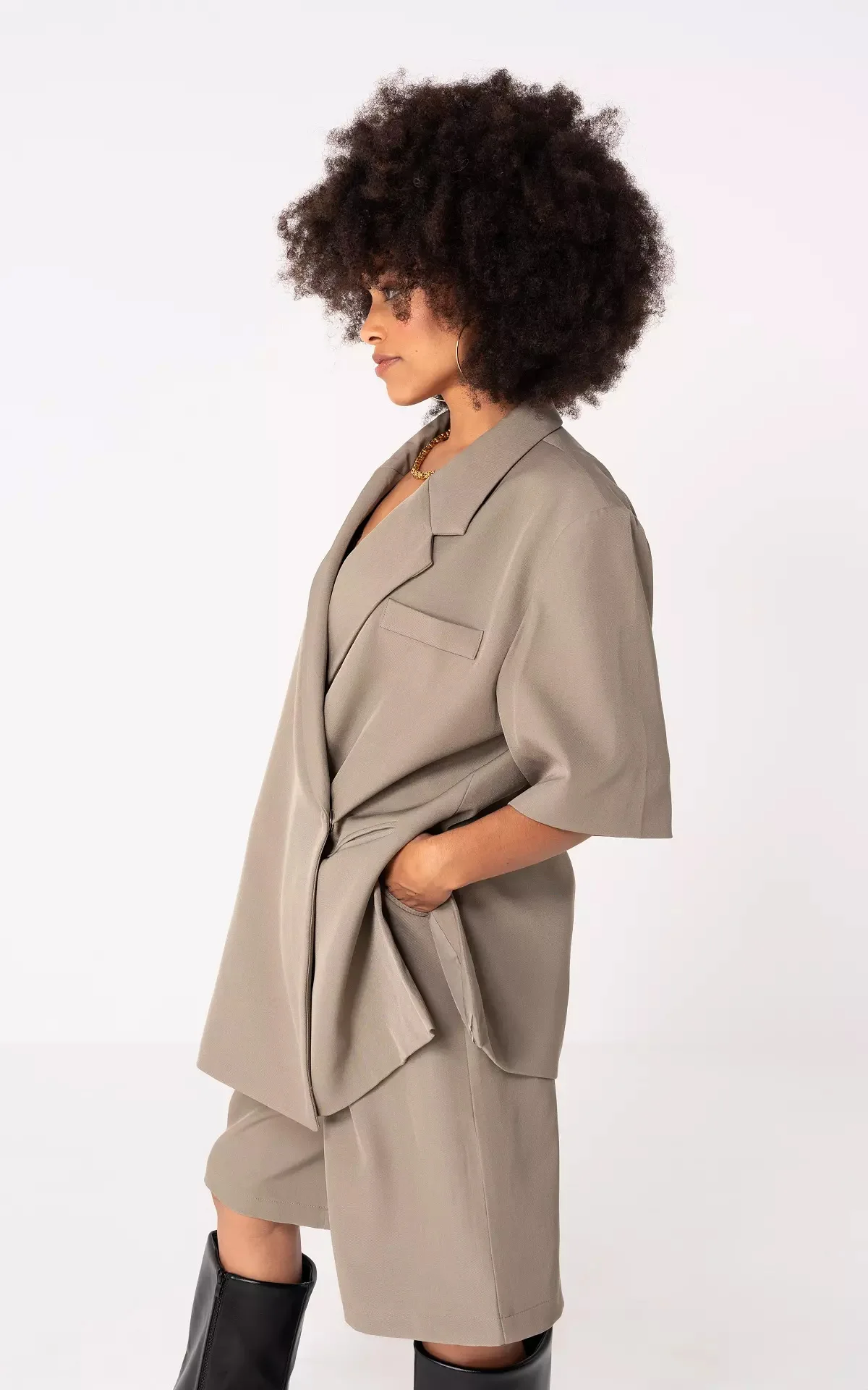 Custom OEM Women's Beige Oversized Blazer - Short Sleeve Snap Closure Jacket for Effortless Chic Confidence Fashion Chic Blazer