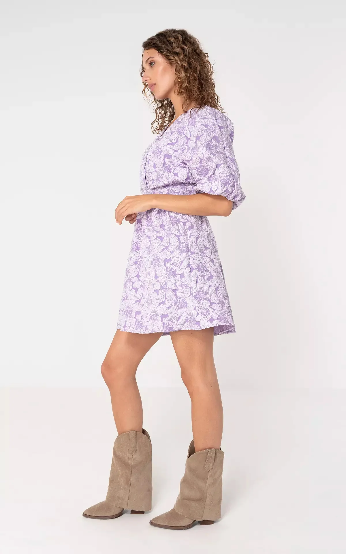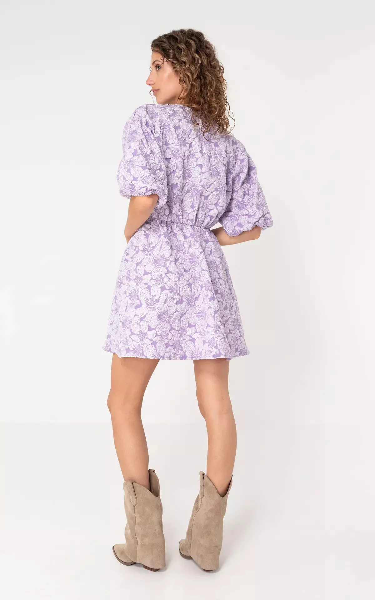 Custom OEM Women's Lilac Jacquard Midi Dress - V-Neck Puff Sleeve Luxe Fit-and-Flare Gown for Weddings & Garden Parties Dresses