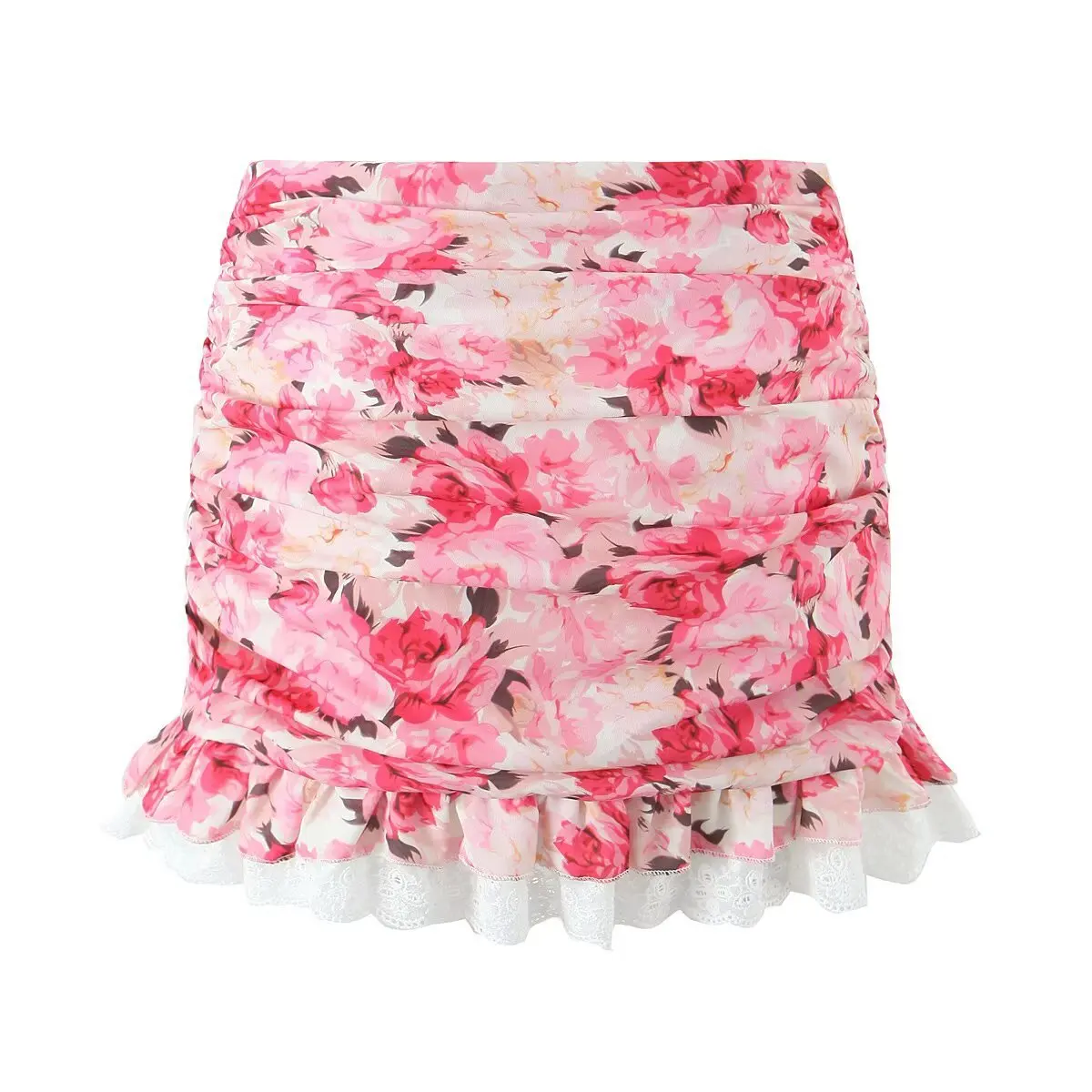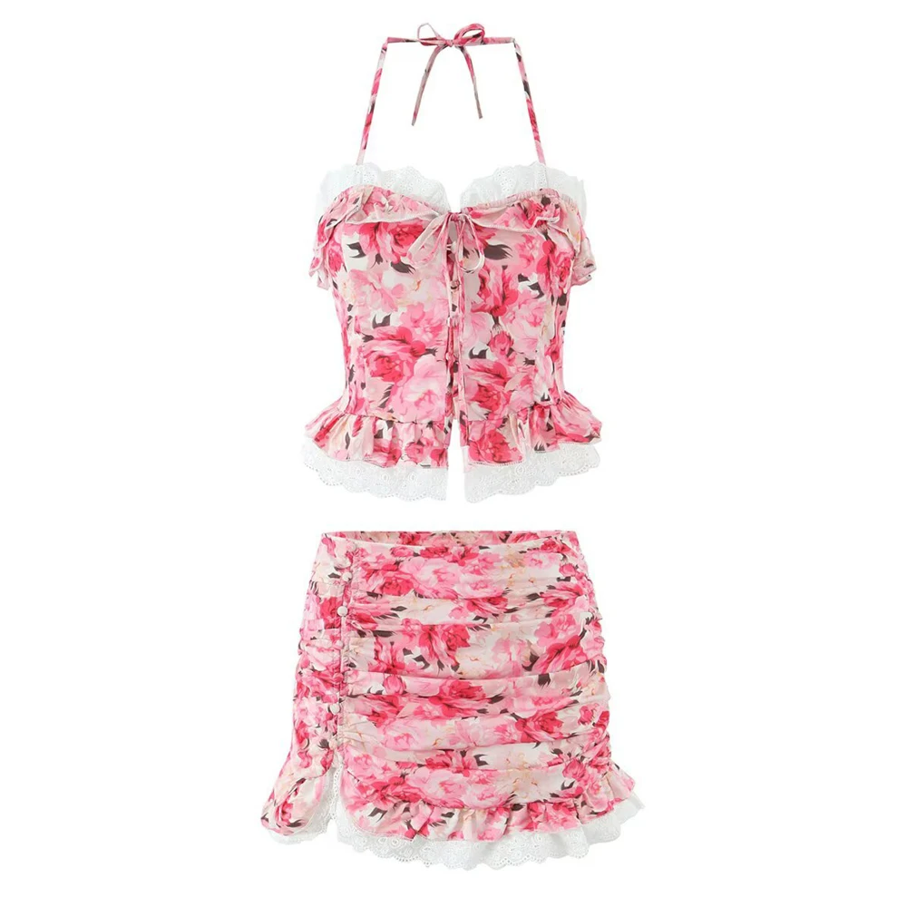 Custom OEM Women's Sweet Floral Print Coord Set | Halter Tie Neck Crop Top & Ruffle Trim Midi Skirt Outfit OOTD Y2K Girl's Sets