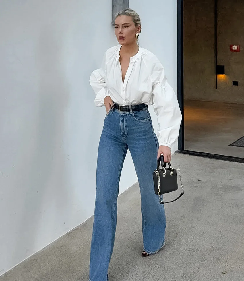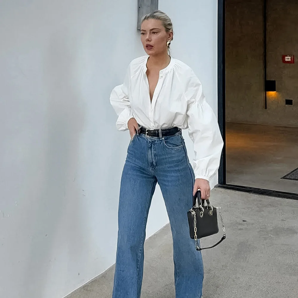 Custom OEM Womens French Style Round Neck Blouse Pure Cotton Long Sleeve Loose Fit White Shirt Office Wear Wholesale Vintage Top