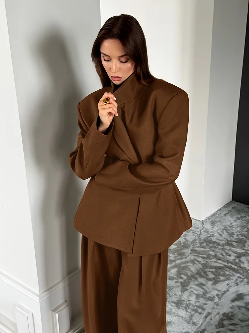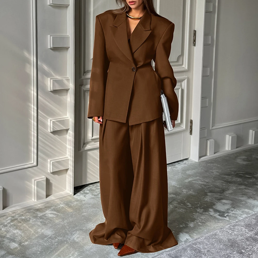 Custom OEM Women's Brown Two-Piece Set Long Sleeve Tapered Blazer with Draped Wide-Leg Trousers Office Wear Wholesale Lady's Set