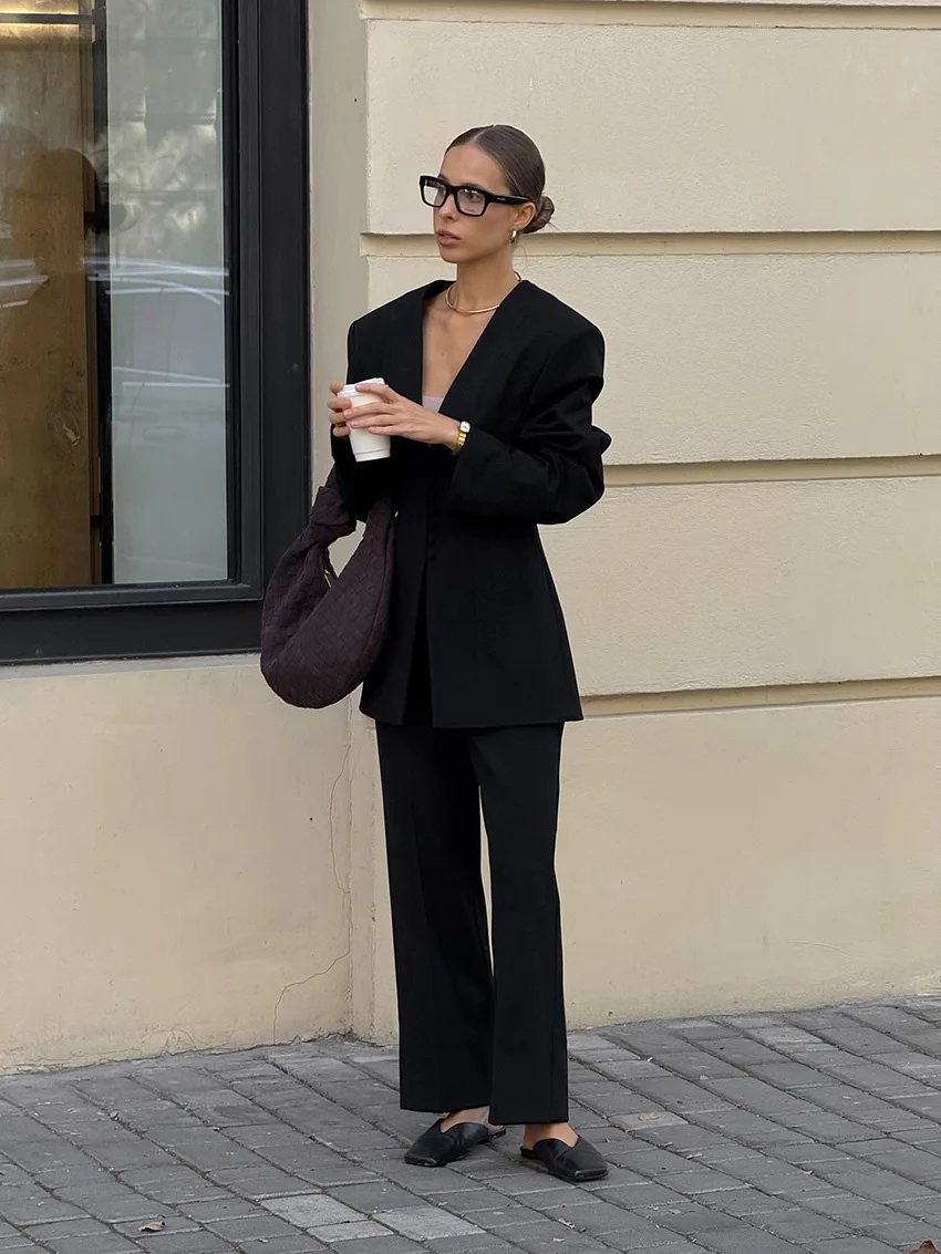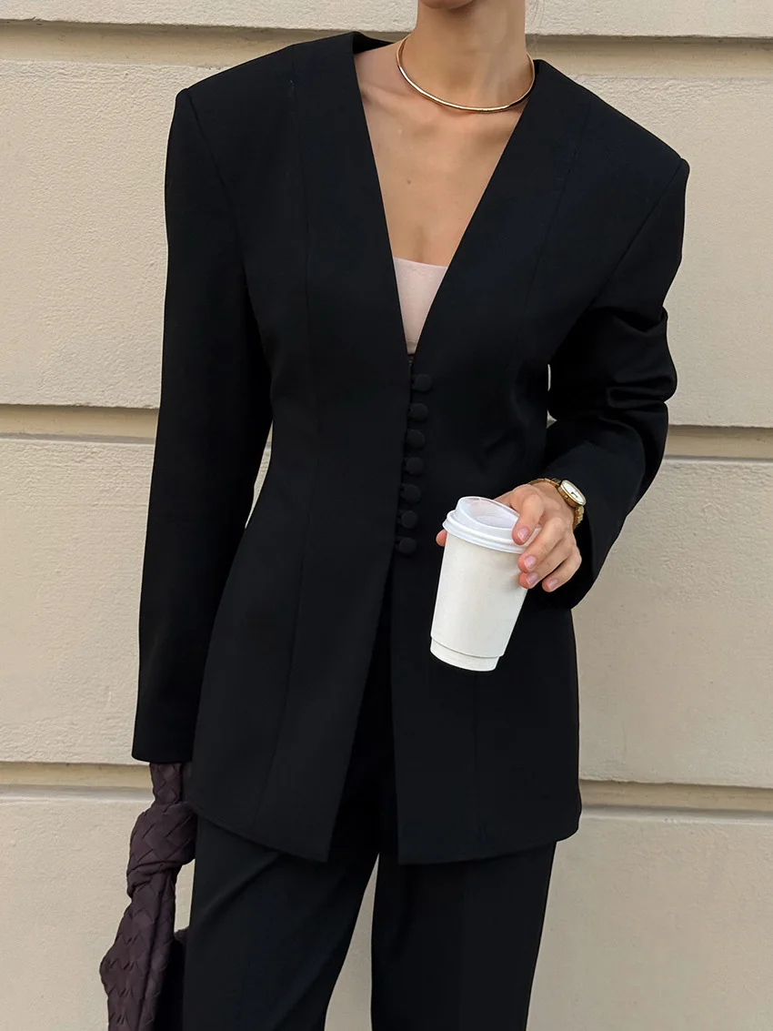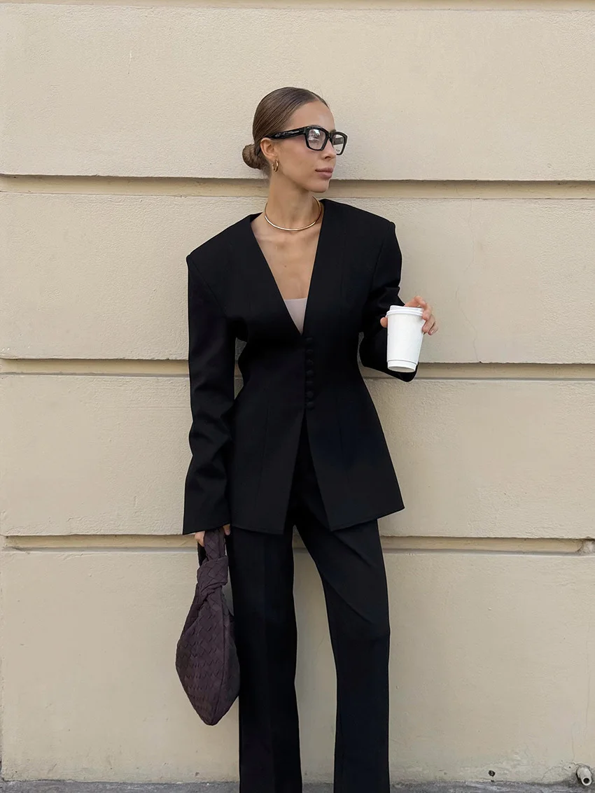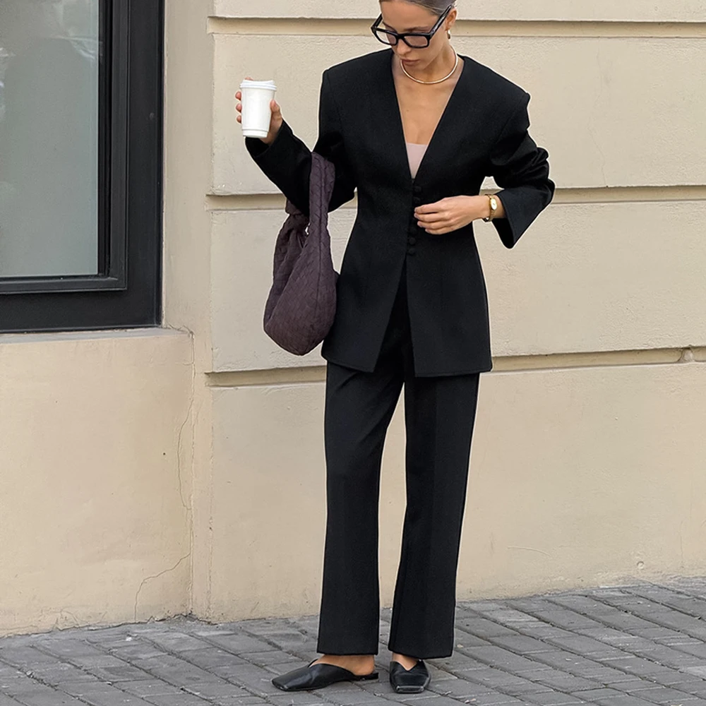 Custom OEM Women Autumn Winter Vintage Black Tailored Slim Fit Blazer Straight Leg Pants Two Piece Set Elegant Casual Wholesale