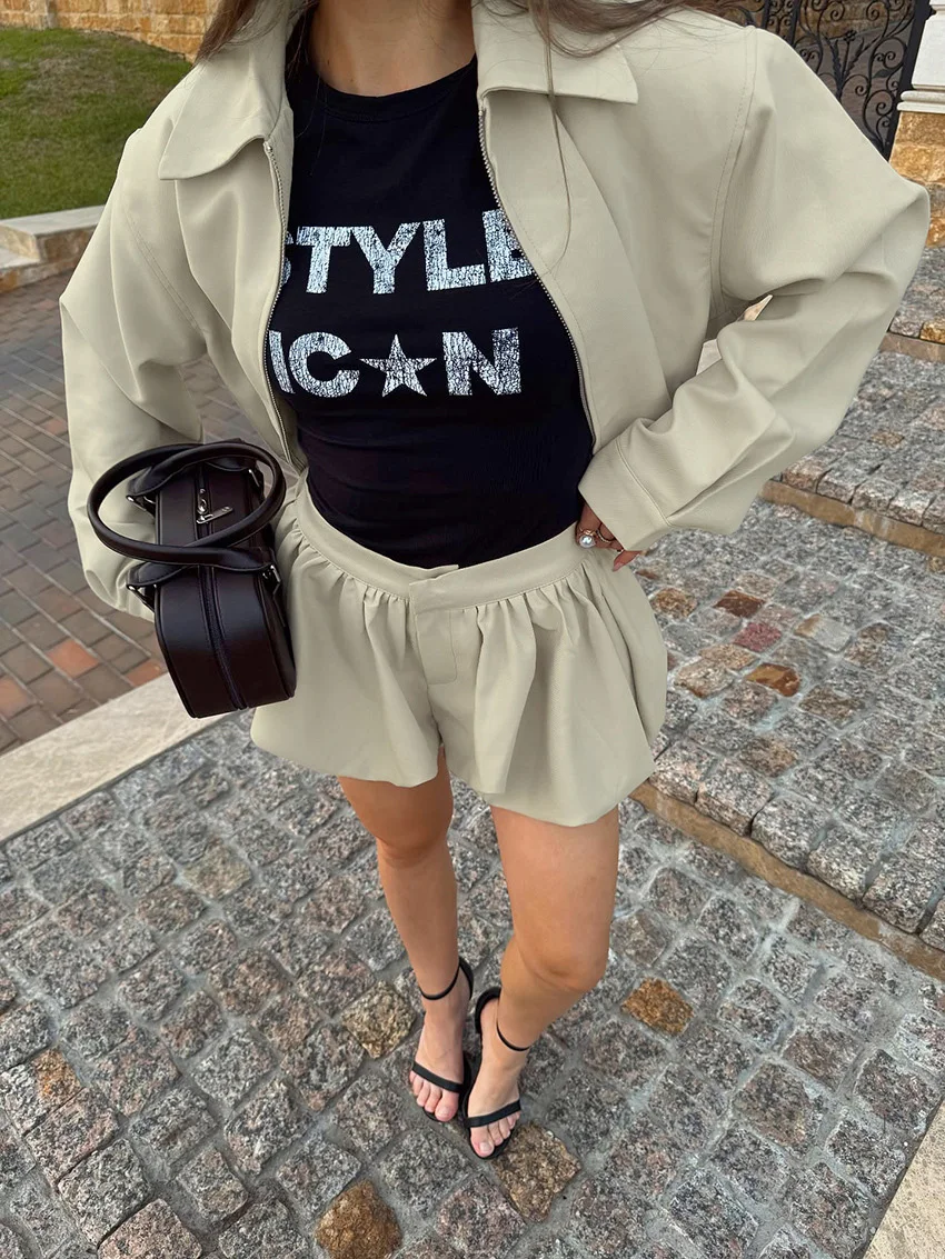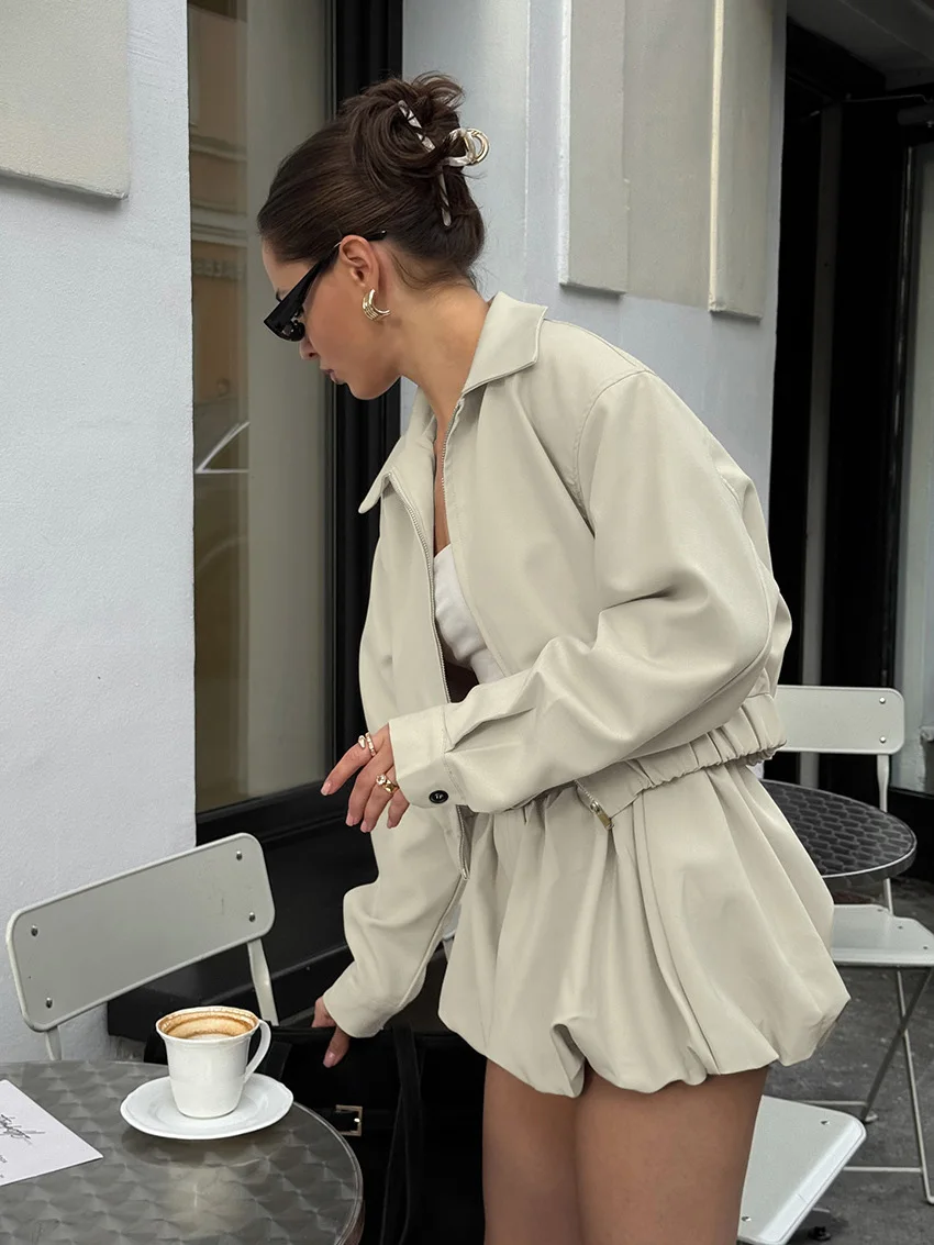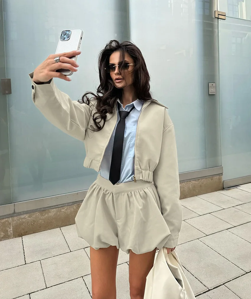 Vintage Women 2 Piece Set Long Sleeve Lapel Cropped Trench Jacket Top and High Waist Paperbag Shorts Ladies Casual Suit Sets OEM