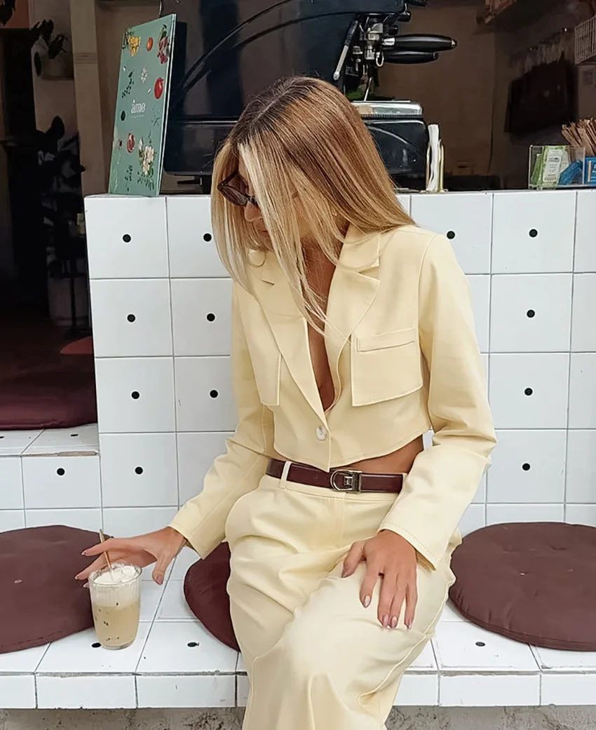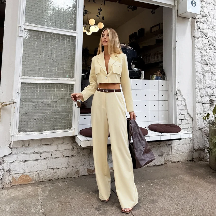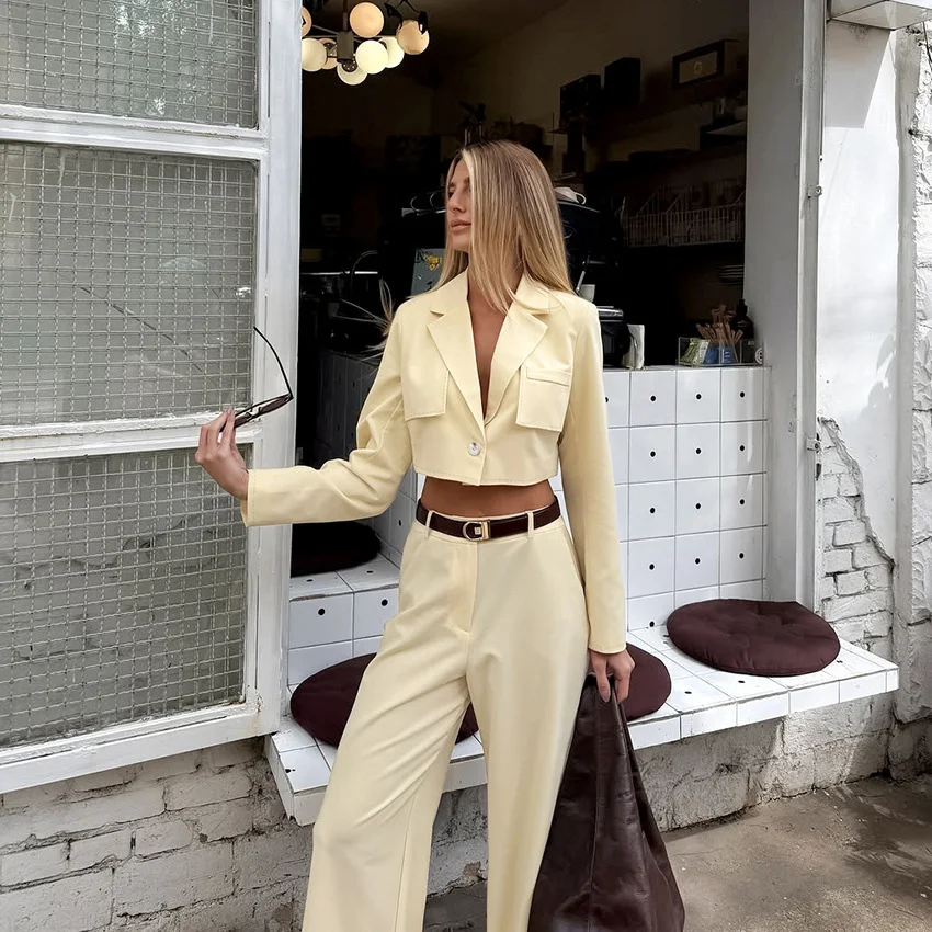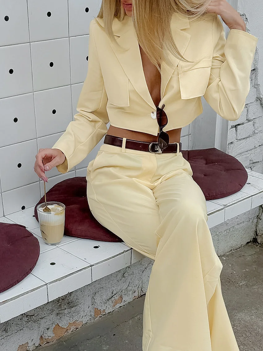 Autumn Vintage Style Women Long Sleeve Cropped Blazer Jacket High Waist Straight Leg Suit Pants Ladies Office Wear 2 Piece Sets