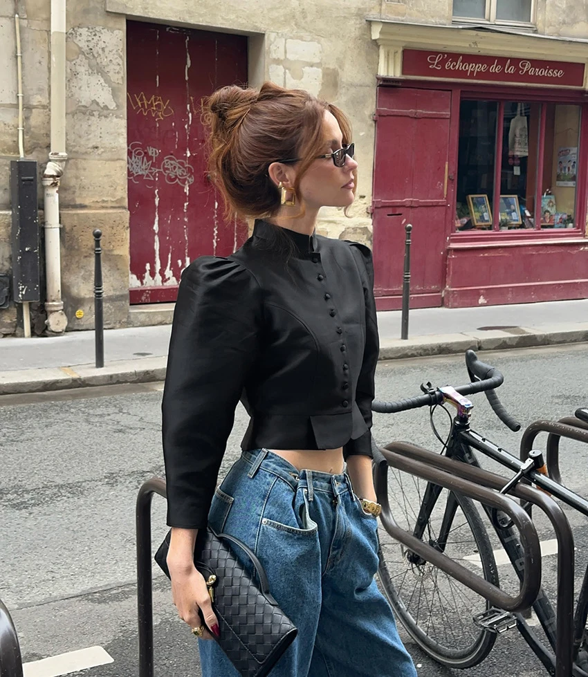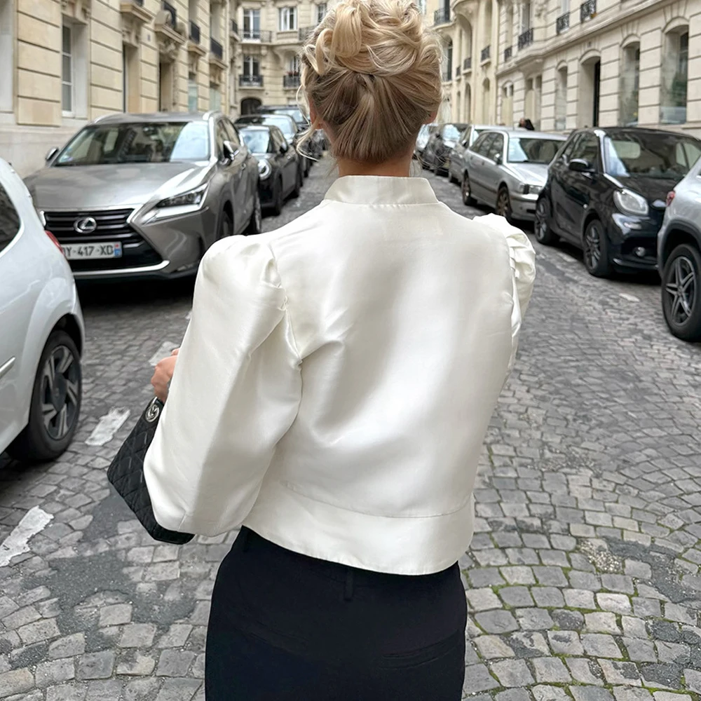 Custom Made Womens French Style Stand Collar Blouse with Puff Sleeves Satin Office Wear Royal Court Elegant Shirt Luxury Tops
