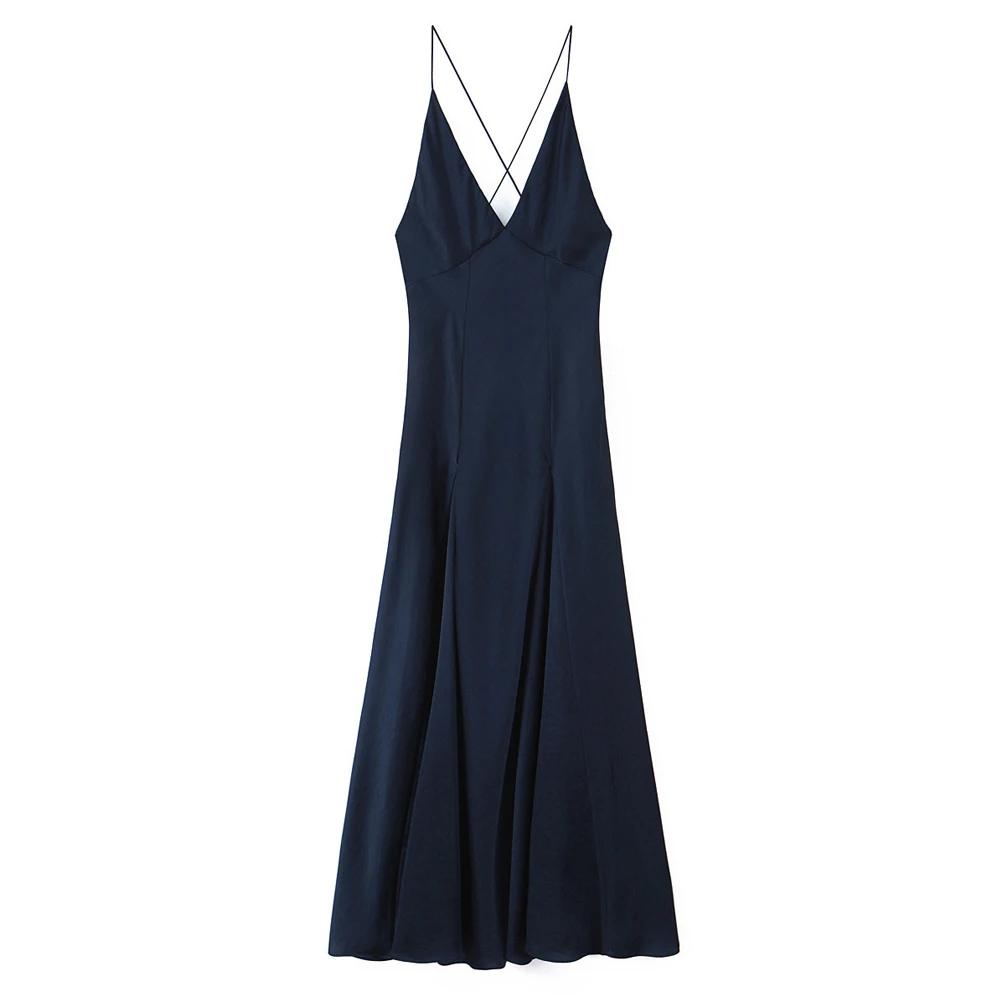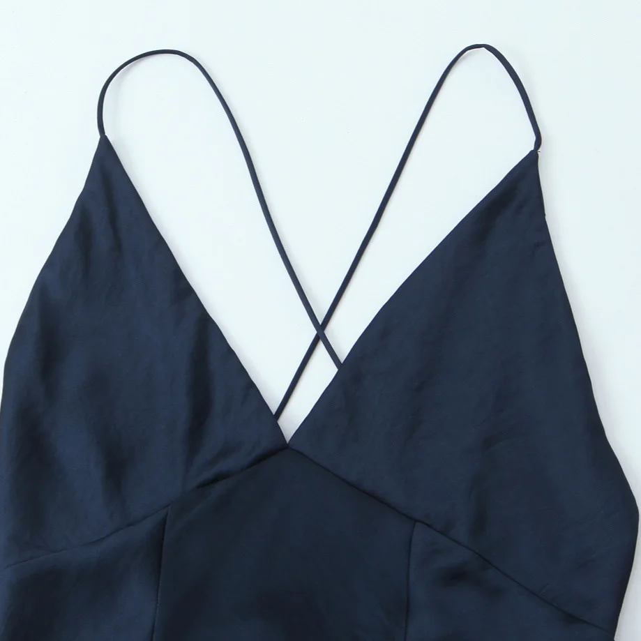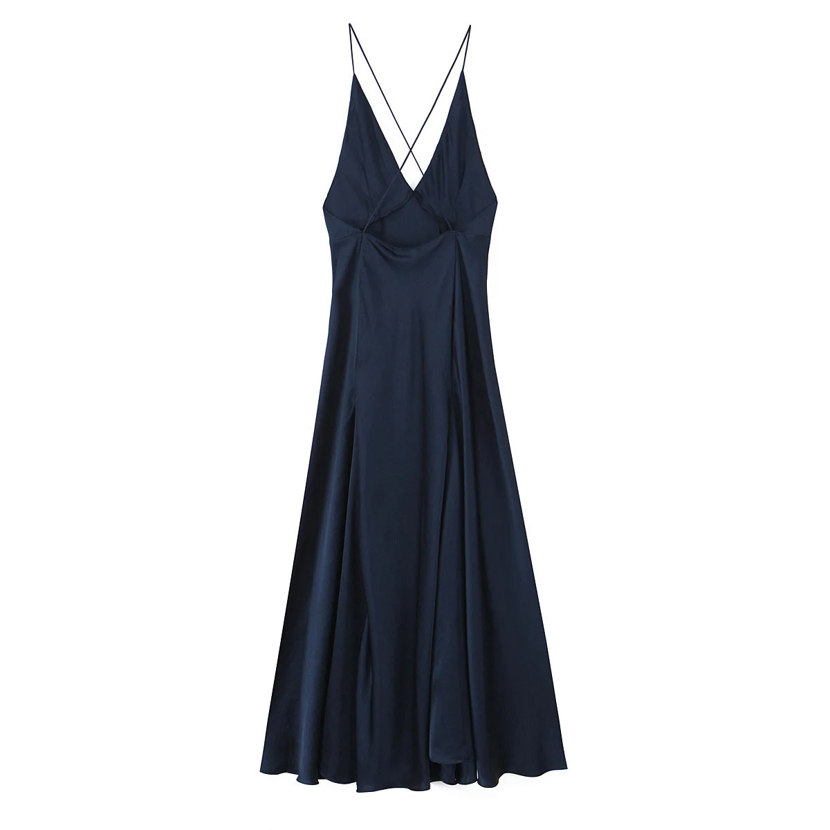 Custom Women Line Slit V Neck Thin Strap Satin Long Maxi Dress European Style Wholesale Clothing Factory Spaghetti Strap Dress