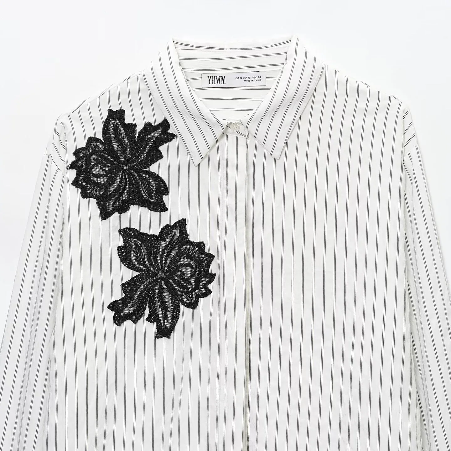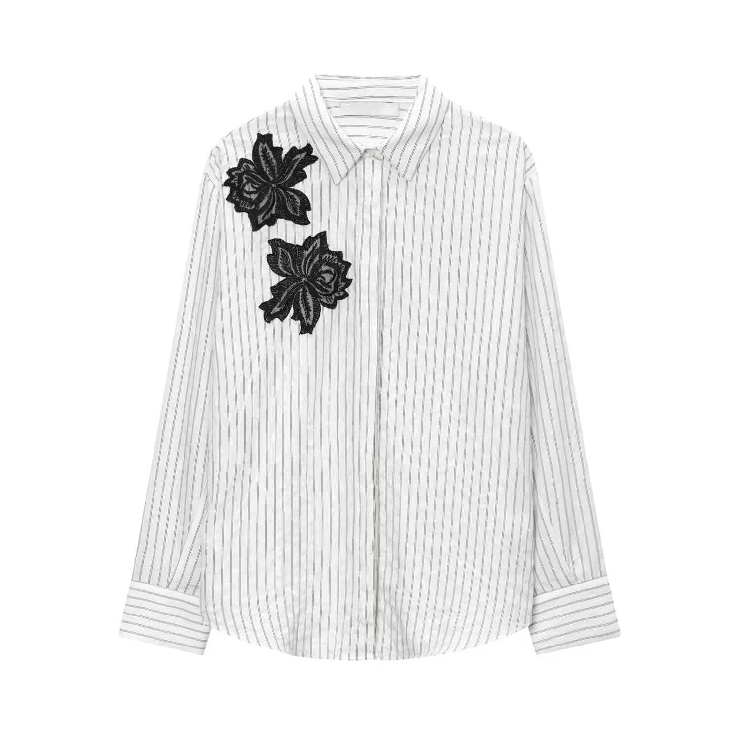 Custom Embroidered Floral Lace Applique Striped Shirt Women's Vintage Style Blouse for OEM Wholesale Long Sleeves Casual Shirts