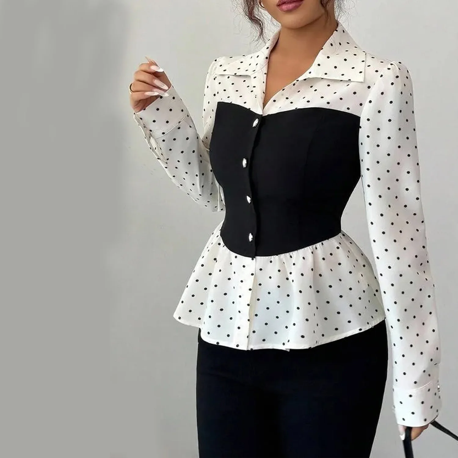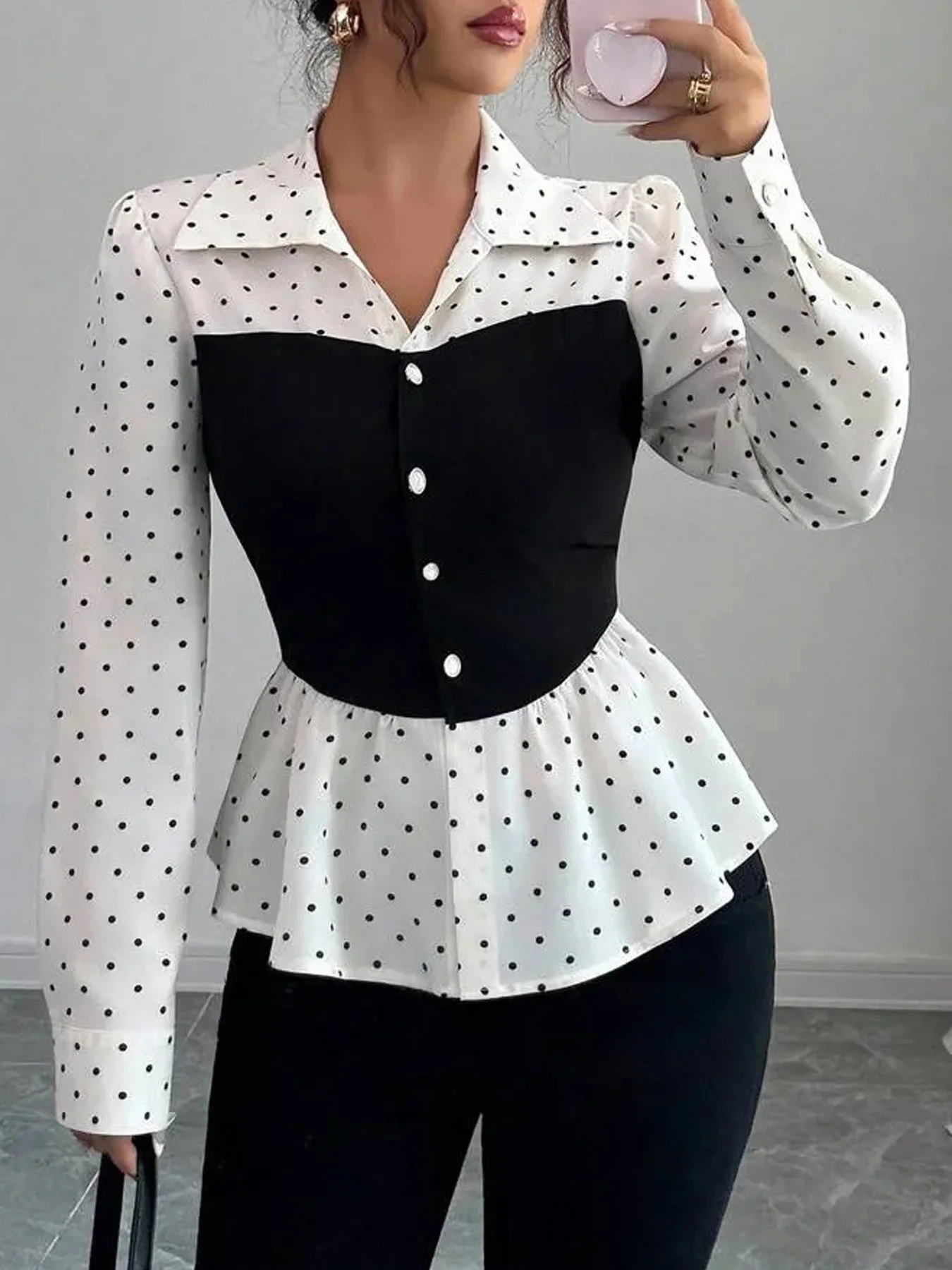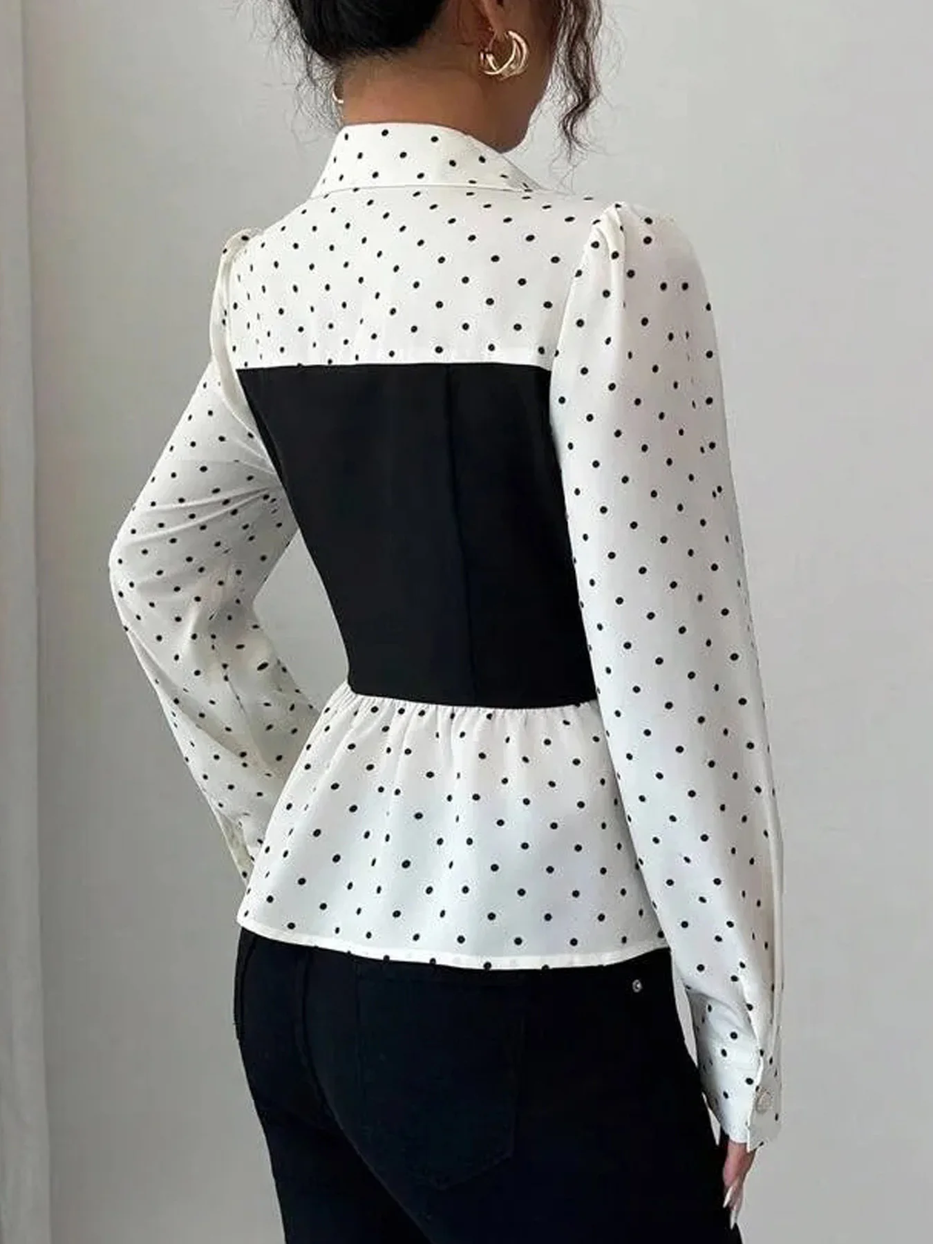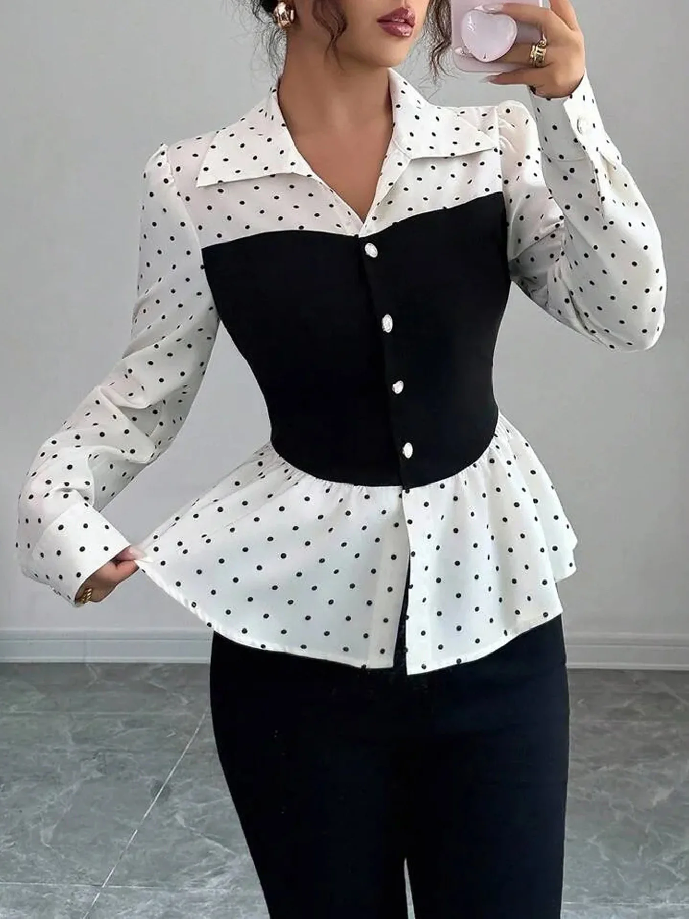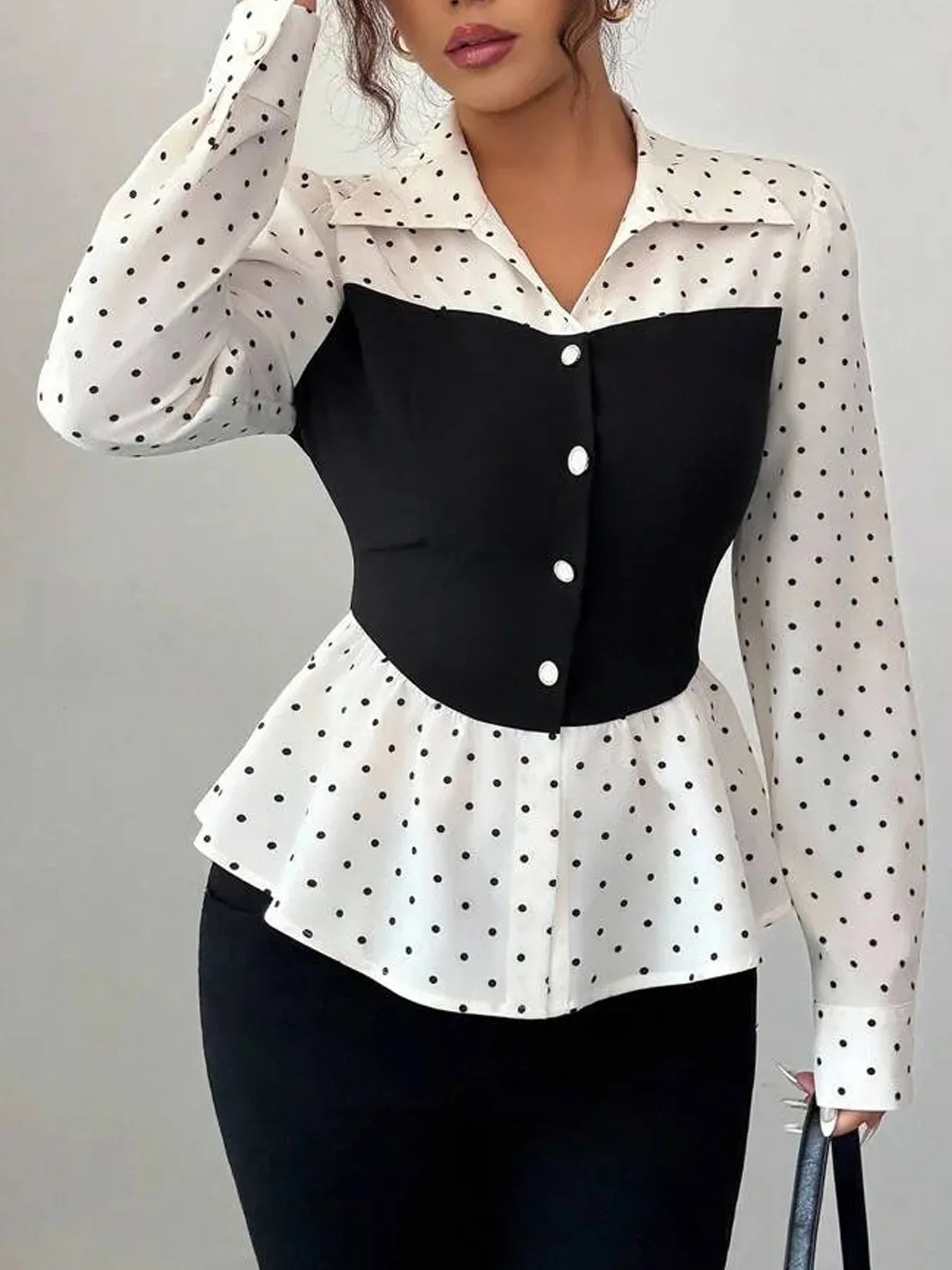 New Women's Polka Dot Patchwork Faux Two-Piece Blouse Ruffle Hem Long Sleeve Shirt Custom OEM/ODM Manufacturer Ladies Top Shirt