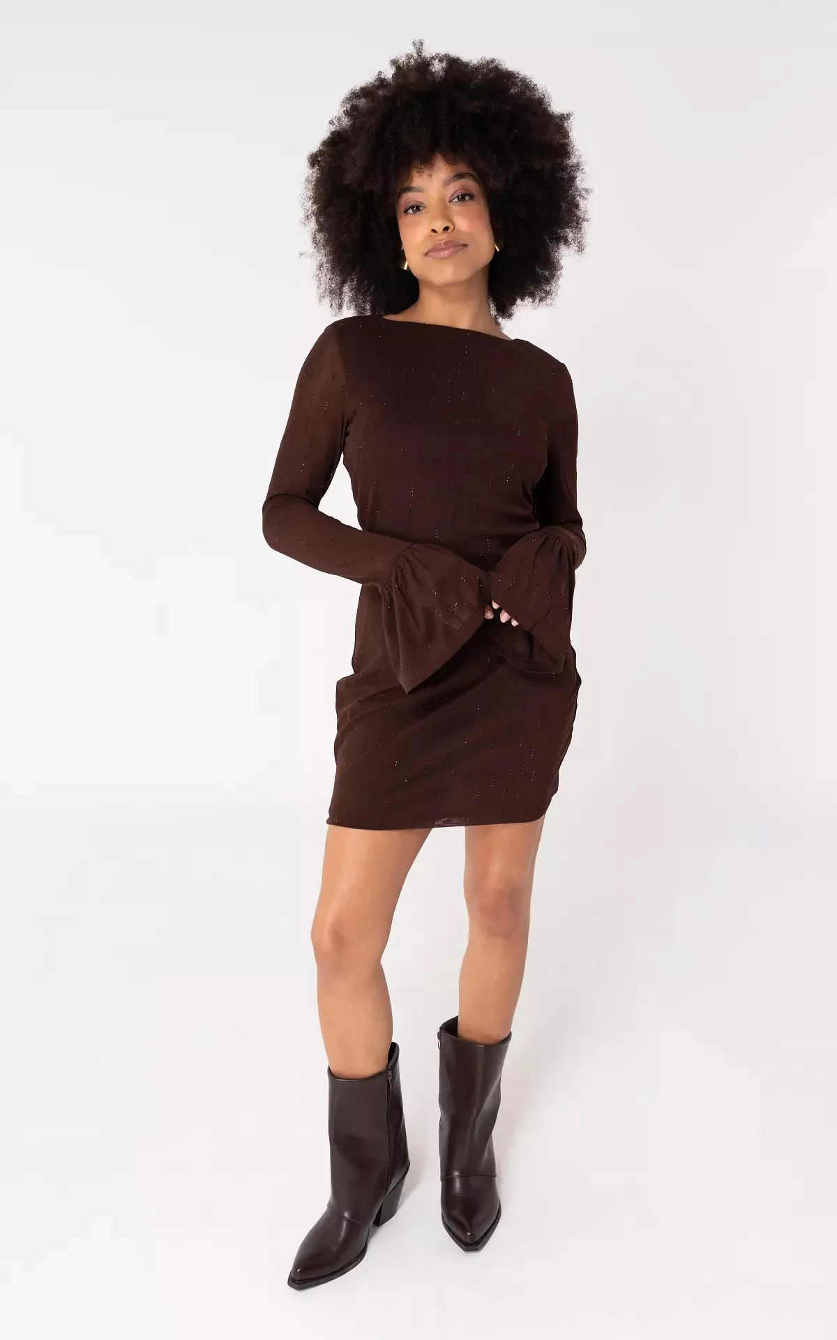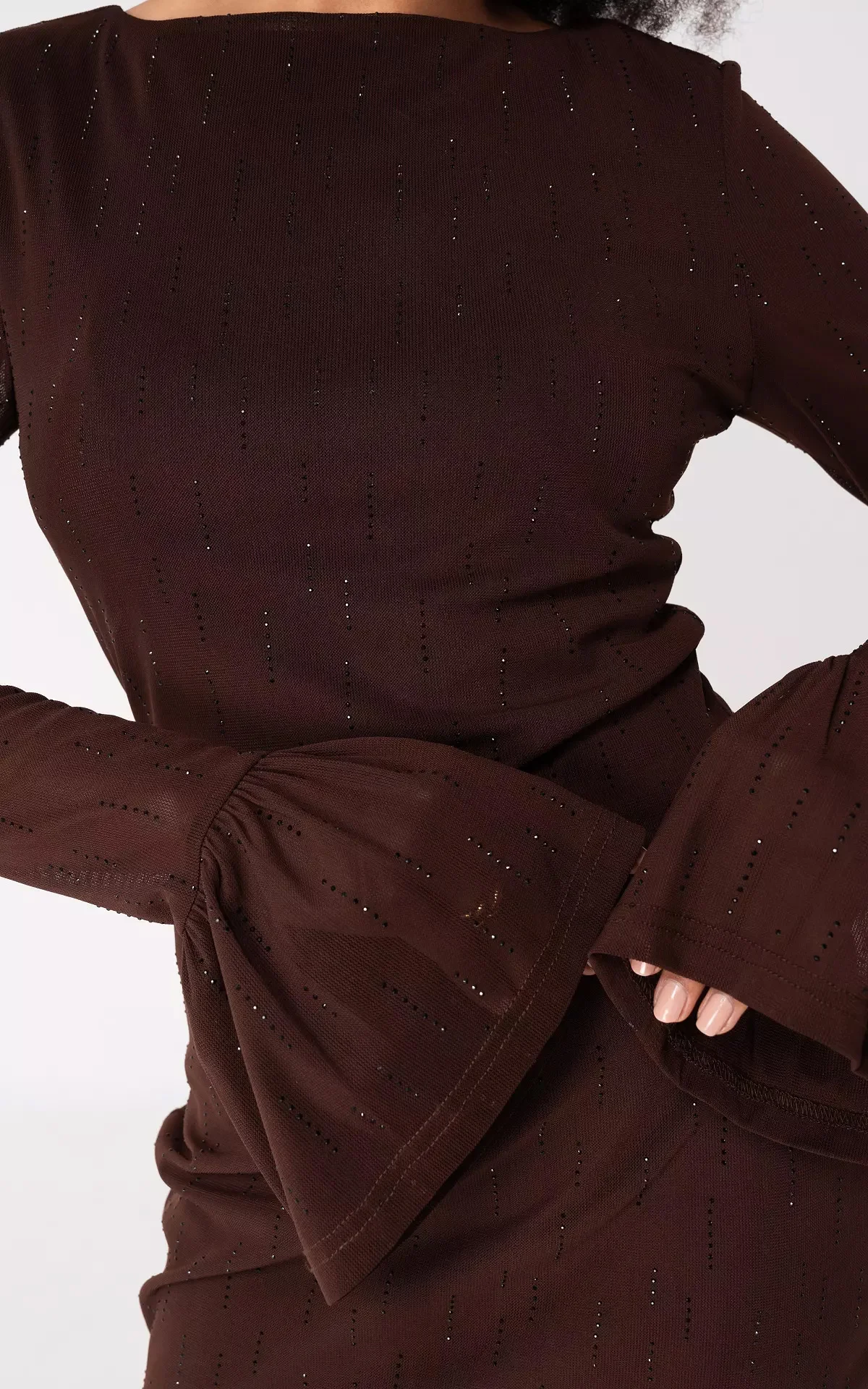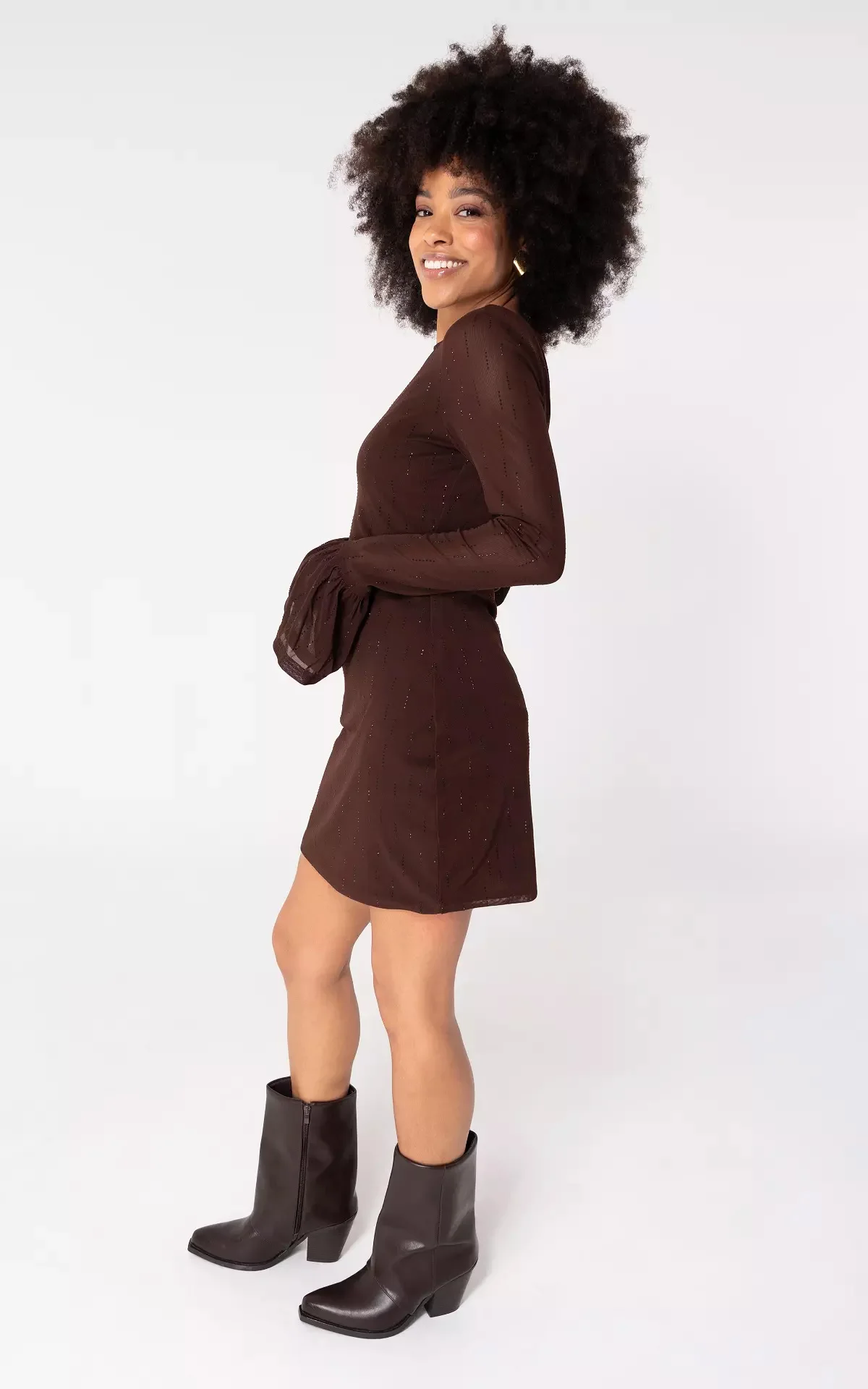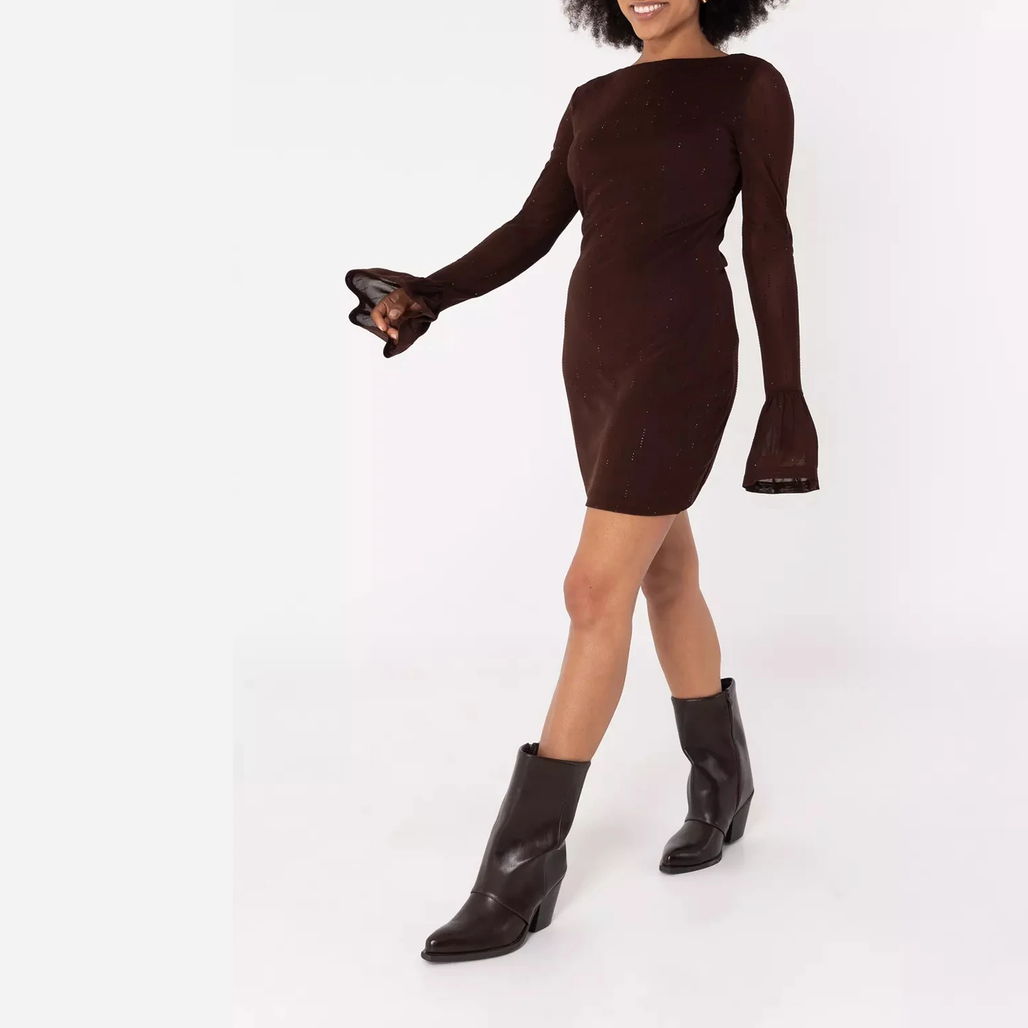Custom Women Dark Brown Sheer Glitter Bodycon Dress Round Neckline Chic Party Mini Clubwear Night Out OEM ODM Factory Wholesale
