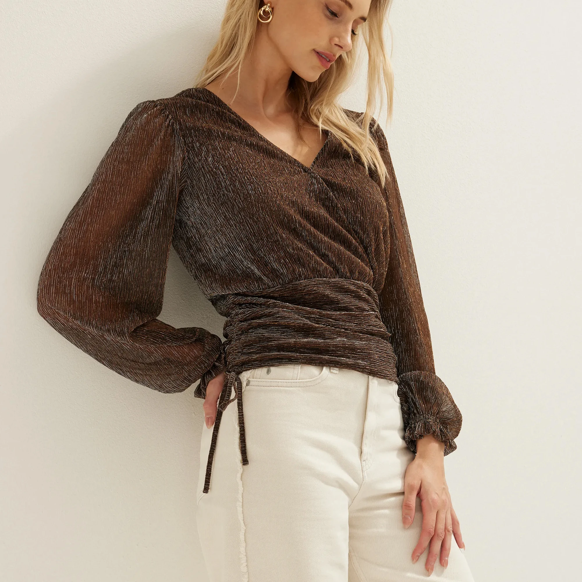 Custom Women Glitter V-Neck Shirt Metallic Thread Long Sleeve Blouse Sparkle Office Top Shimmer Elegant Factory Direct Wholesale