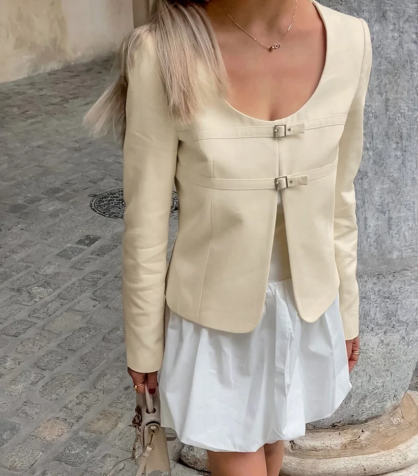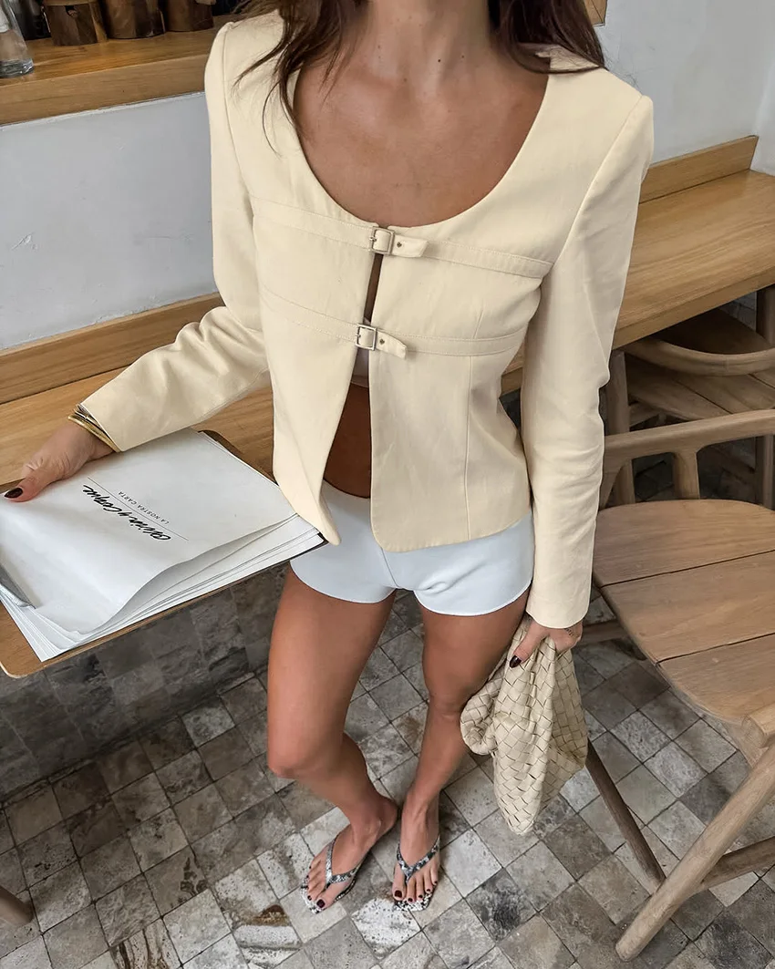 Custom Women U-Neck Blazer in Apricot Lightweight Niche Design Casual Elegant Office Jacket Soft Shoulder ODM OEM Factory Direct