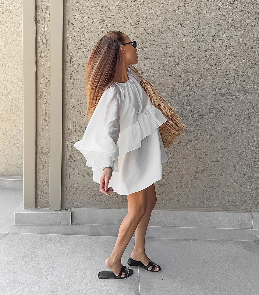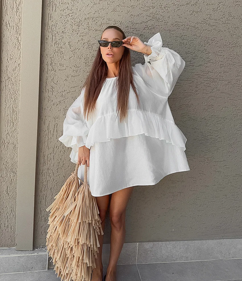 Custom Women Relaxed Fit White Dress with Layered Ruffle Hem OEM Factory Wholesale Bohemian Style Flowy Vintage Mini Dresses