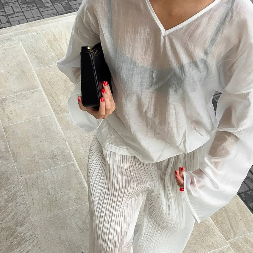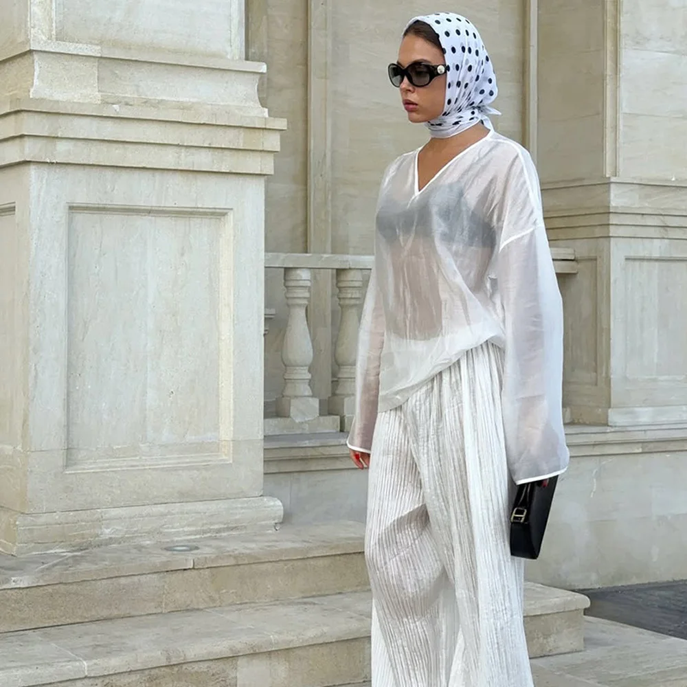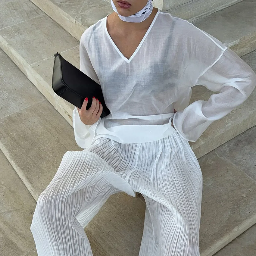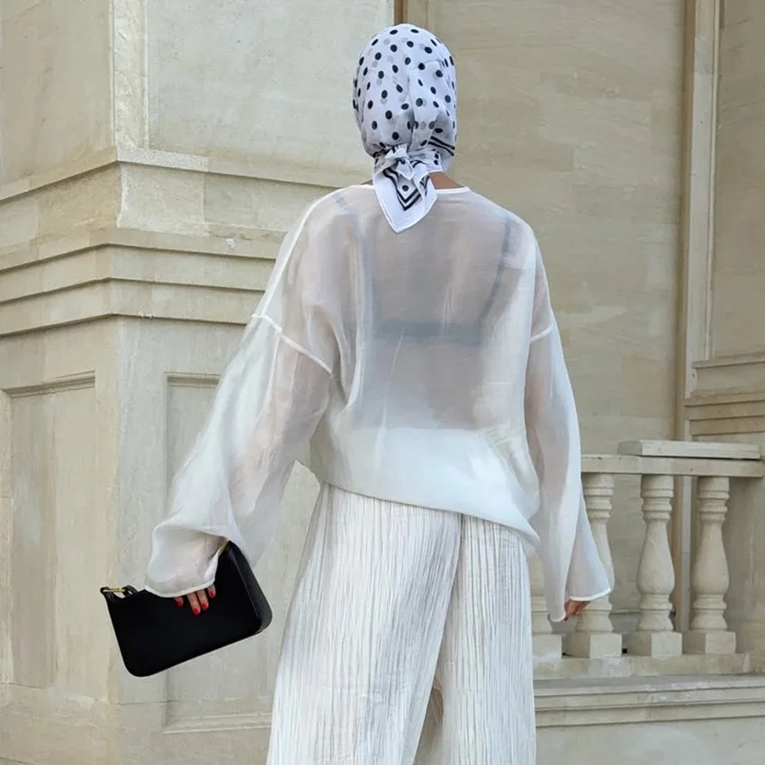Custom Women Sheer Cover up V Neck Long Sleeve Sun Protection Top Relaxed Drapey Loose Fit Blouse OEM Factory Wholesale Mesh Top