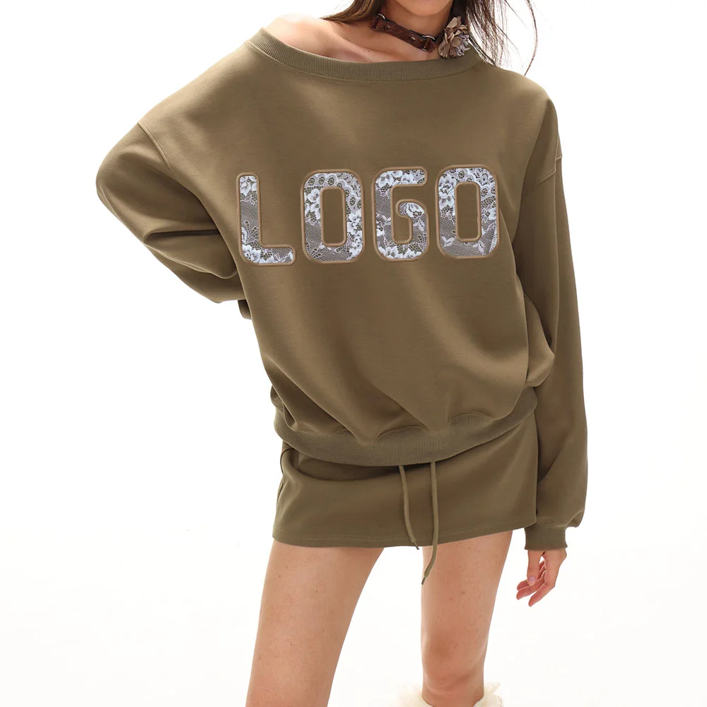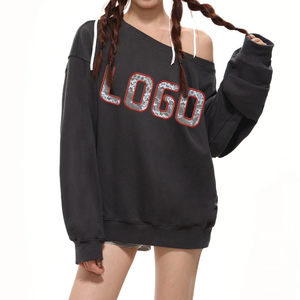 Winter OEM Embroidery Fleece Knitted Women's Sweatshirt Shoulder Custom Logo Front Casual Neckline Baggy Pullover Loose Fit