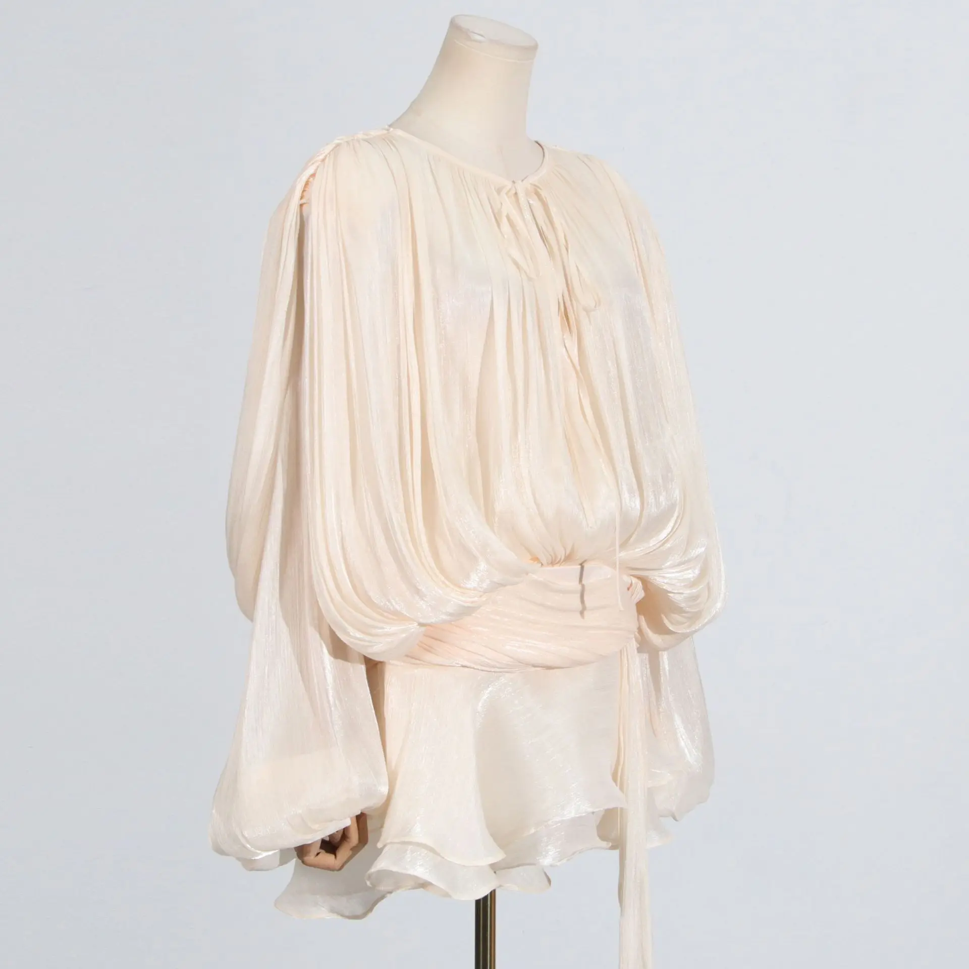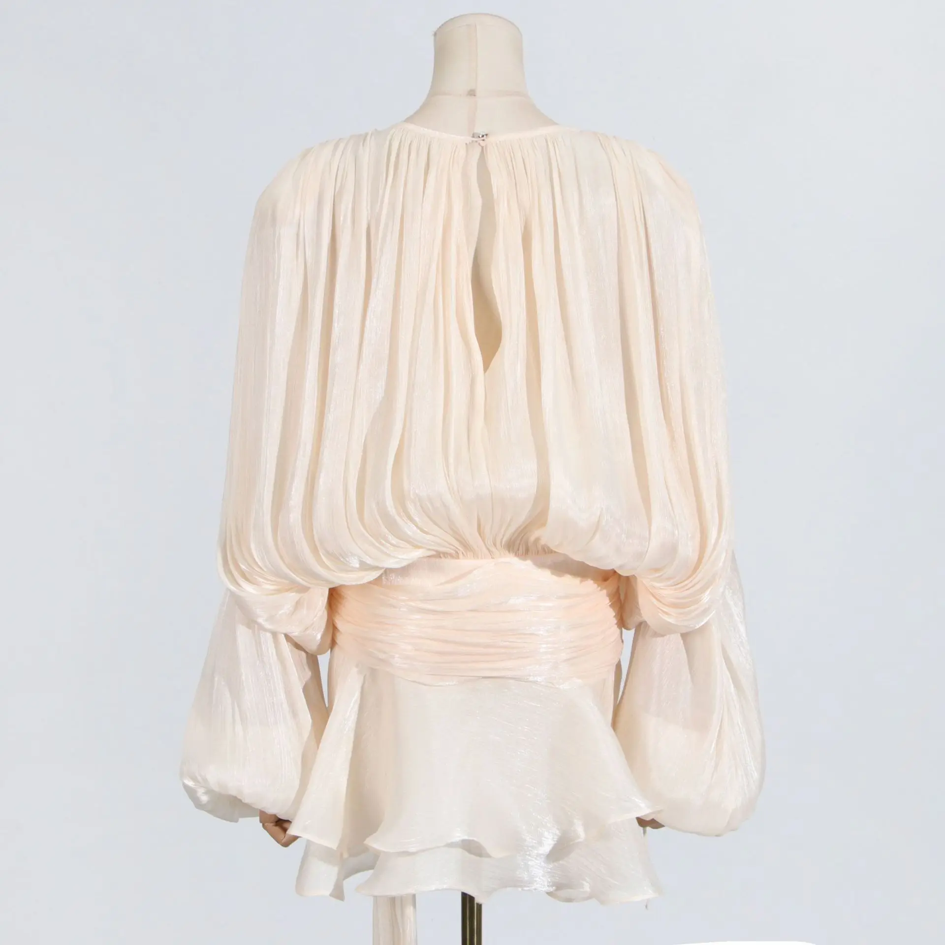 ZYHT 82053 Apricot Lace Top with Tiered Ruffled Sleeves V-Neck & Gold Buttons Blouse Wanita Elegan Women Blouse