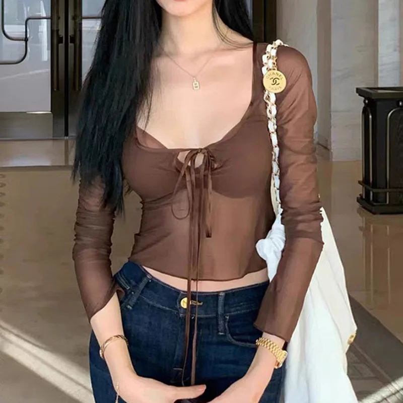 Summer Treasure Mesh Perspective Slim-fit Lace-up Two-piece Top Spice Girl Solid Color Sweet Sexy Women's Top