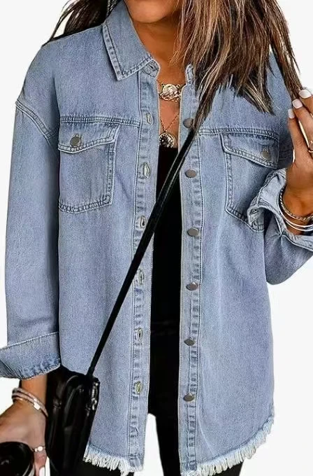 High Quality Blue Oversized Long Denim Jackets Distressed Womens Jean Jacket Wholesale Denim Jackets Suppliers