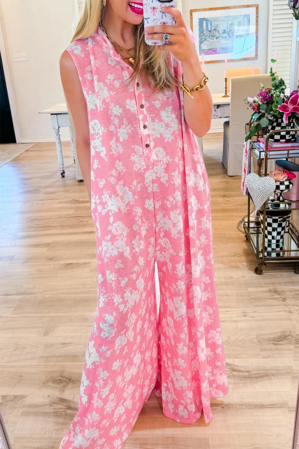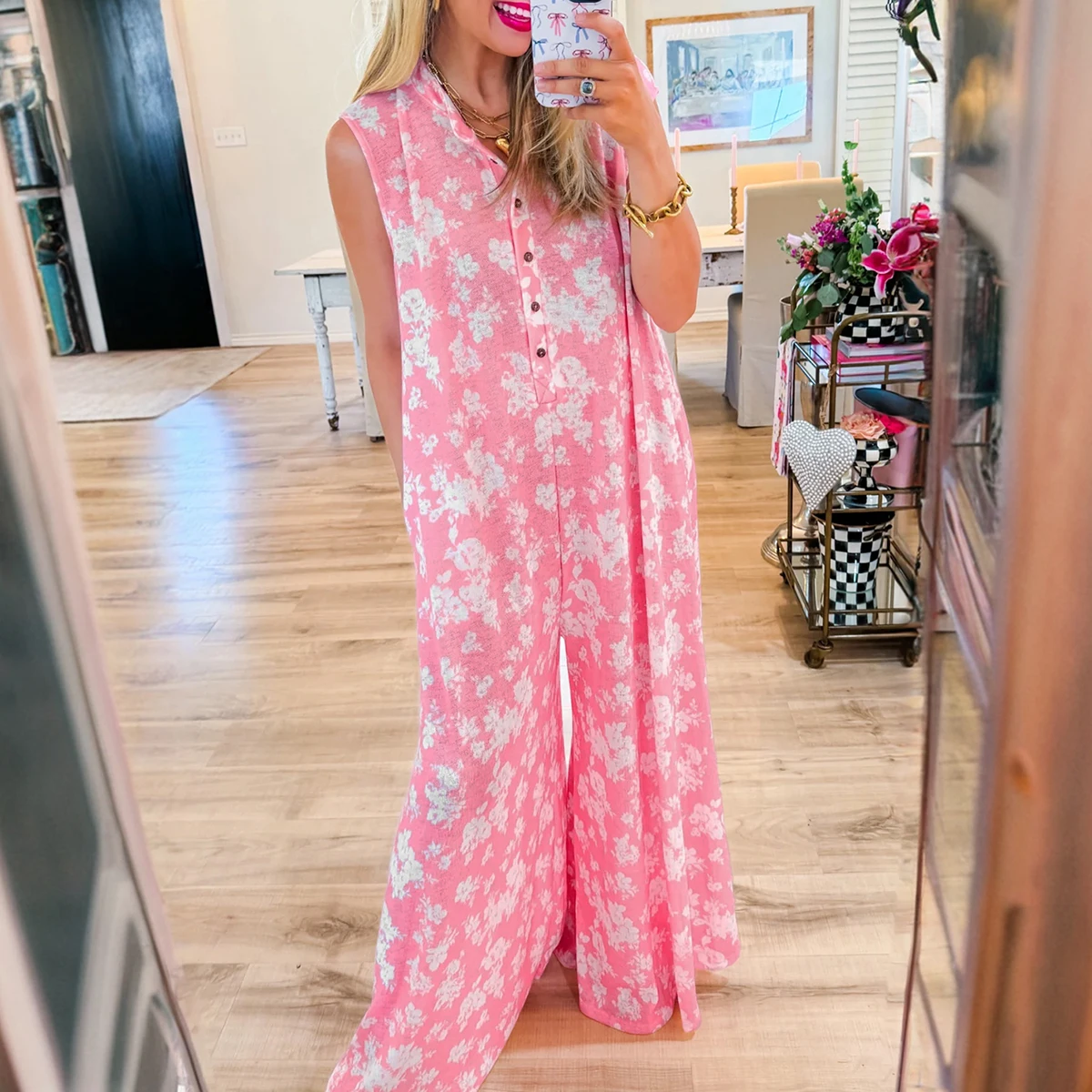 Shewin 2026 Floral Print High Waist Knitted Casual Breathable Half Button Wide Leg Relaxed Sleeveless Loose Full Length Jumpsuit