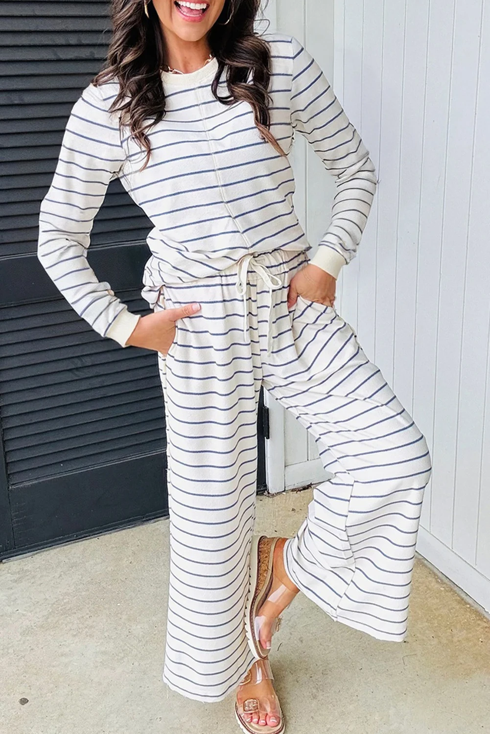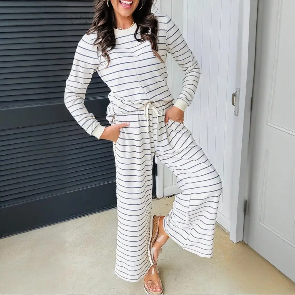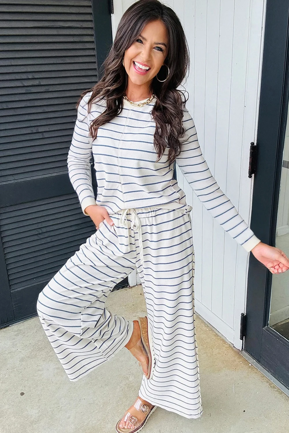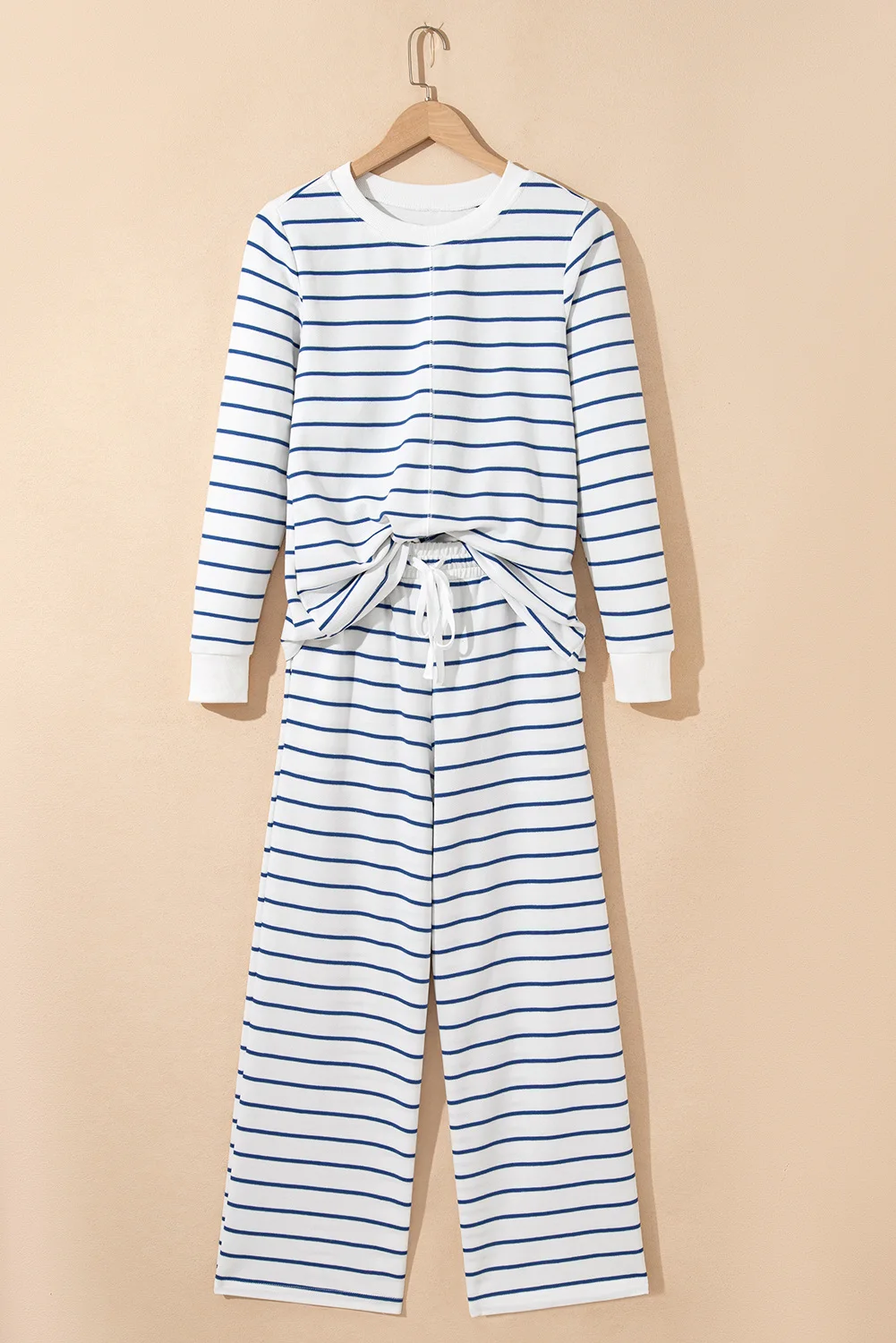 Shewin 2026 Women's Casual 2-Piece Knitting Breathable Blue White Stripe Pajama Set Long Sleeve Top Drawstring Wide Leg Pants