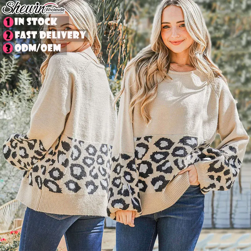 Lady Leopard Color Block Autumn Women's Vintage Knitted Long Sleeve Pullover Sweater