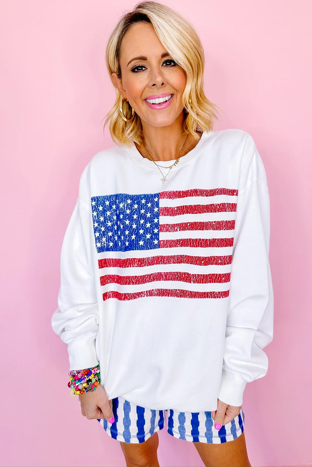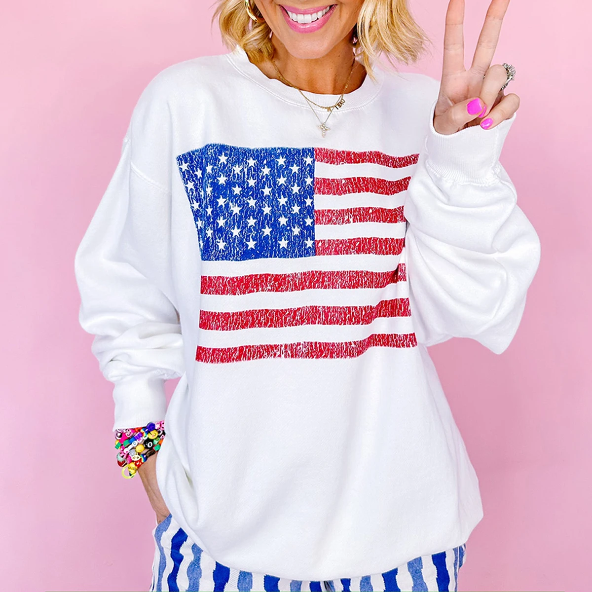 Shewin 2026 White Women's Crew Neck USA Flag Winter Long Knitted Printed Sweatshirt