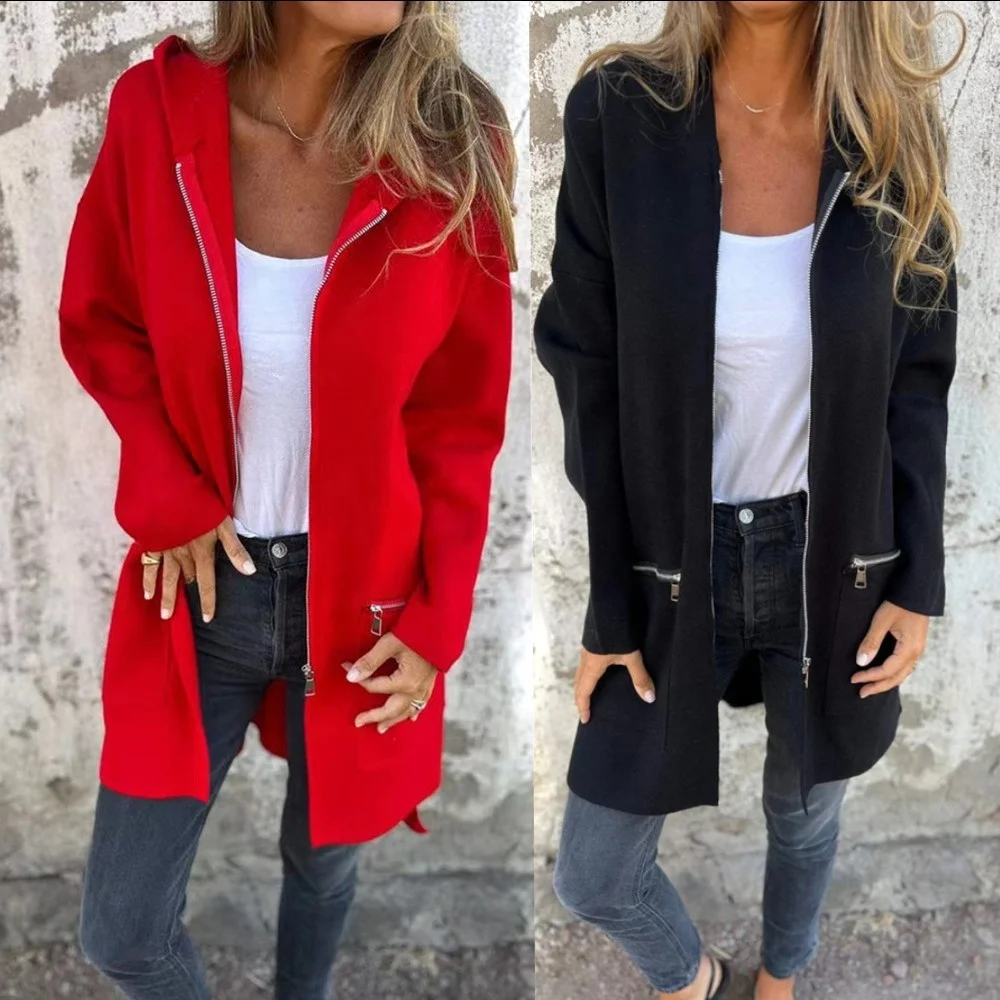 Shewin Fashion Casual Solid Pocket Down Long Sleeves Red Black Autumn Zipper Hoodie 2004 Coat Winter Jacket Woman With Hood