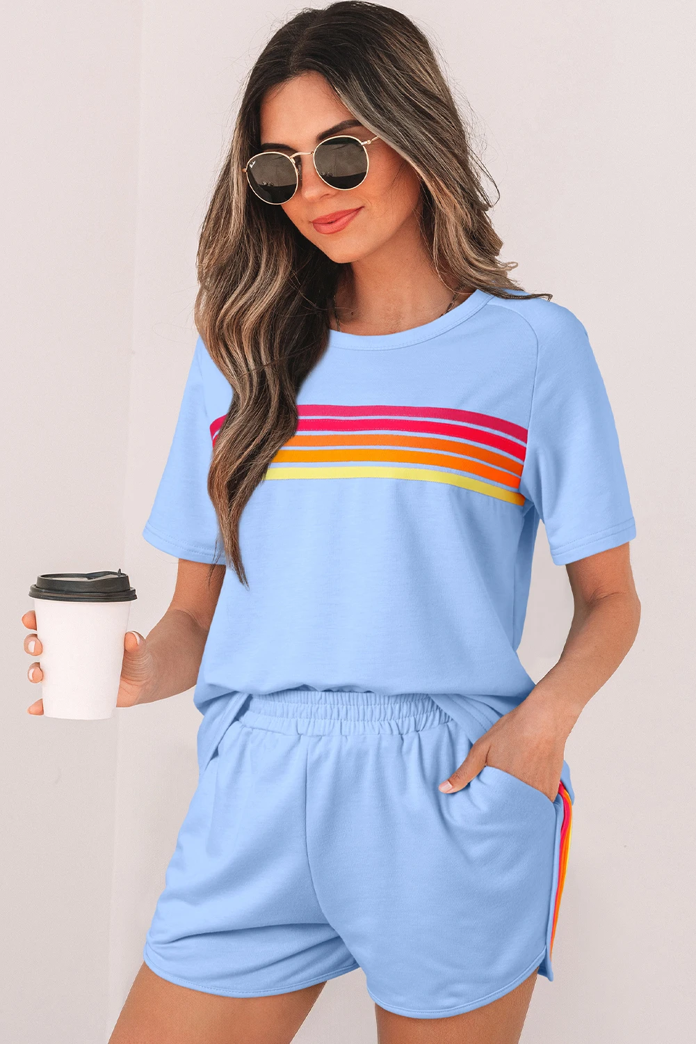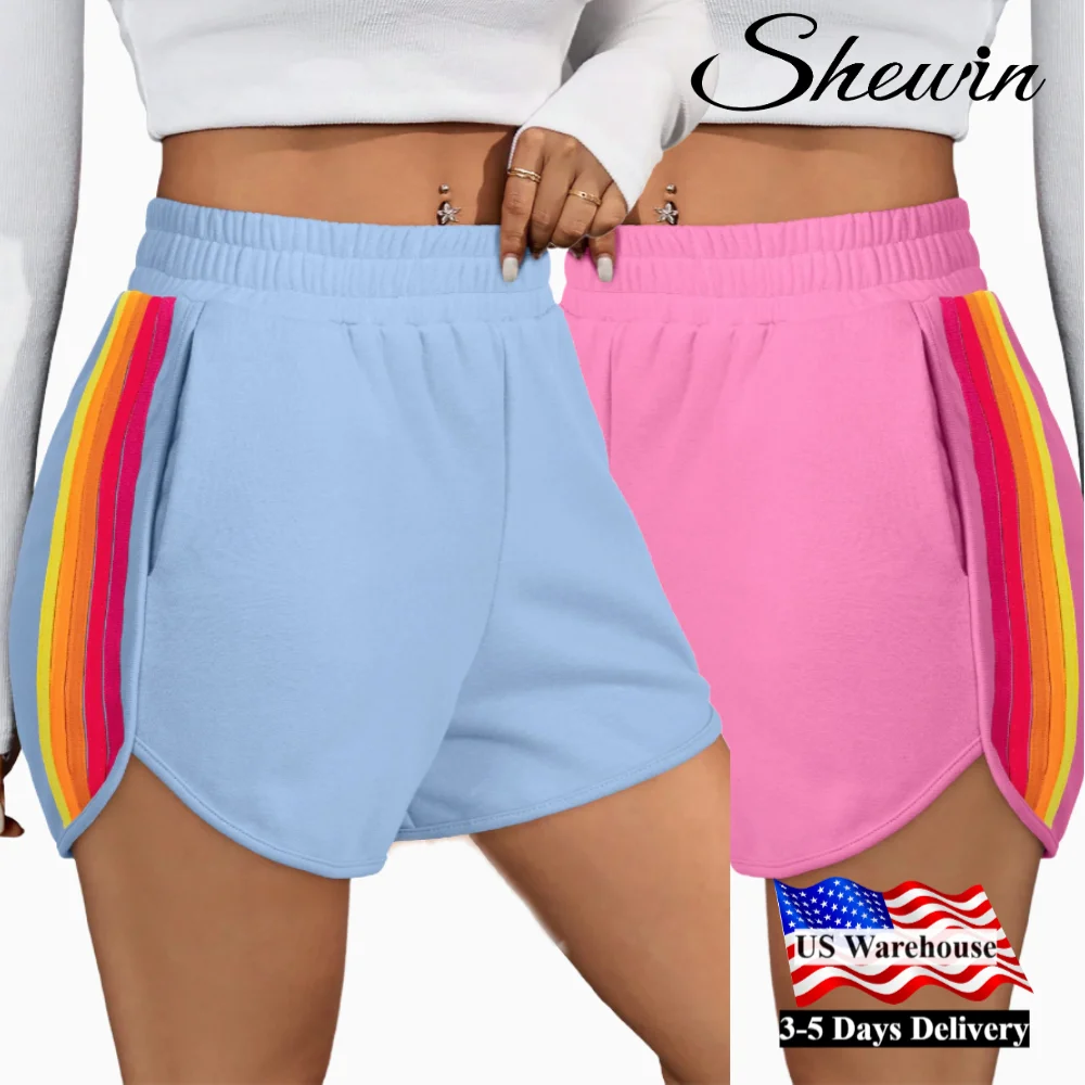 Shewin 2026 Women Pink Blue Color Block Stripes Shorts Elastic High Waist Active Shorts for Women