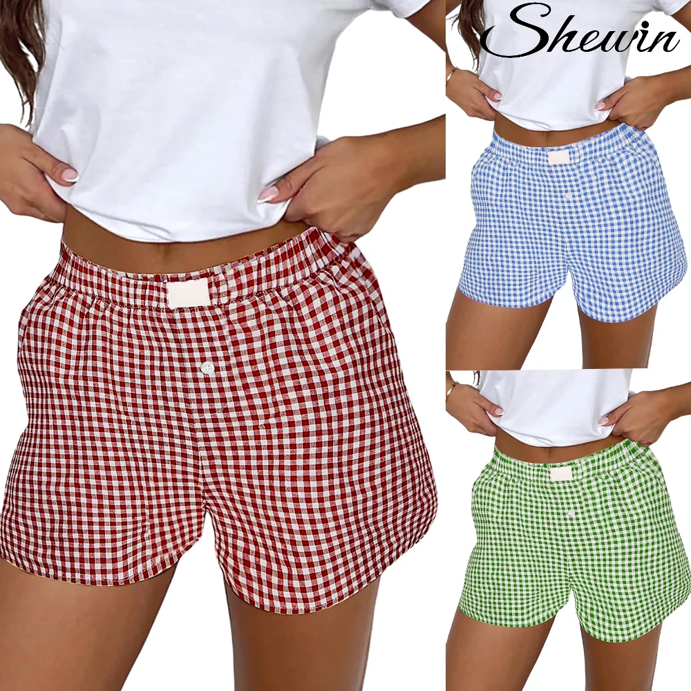 Shewin 2026 Checkered Board Plaid Shorts Casual Checker Boxer Gym Shorts for Women
