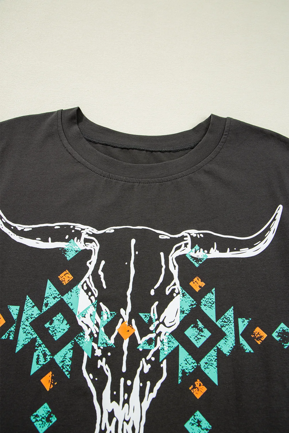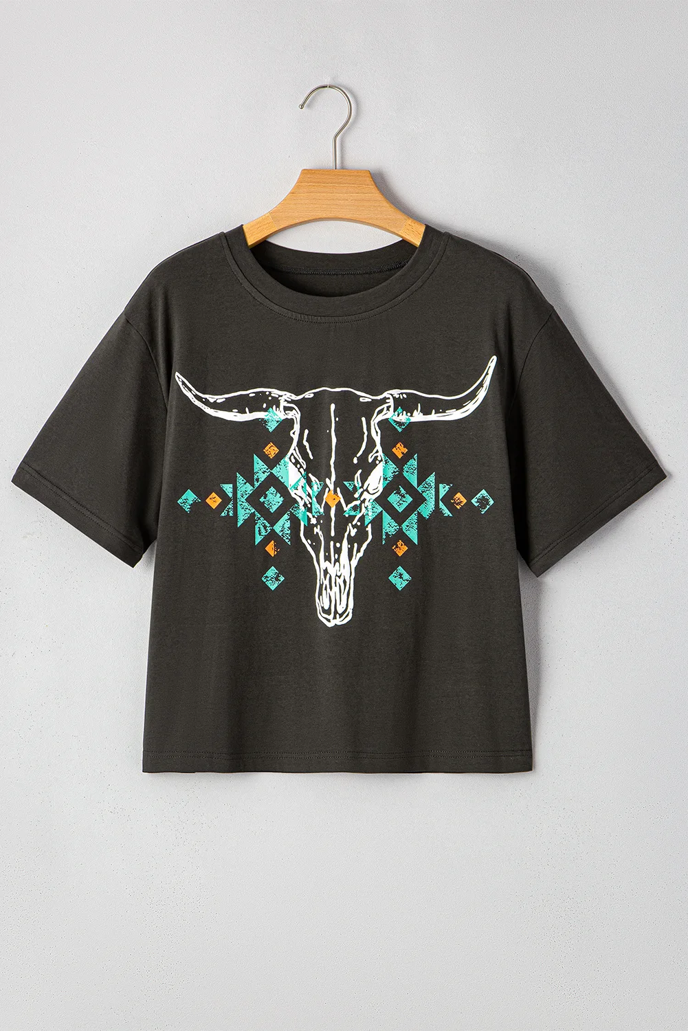 Shewin Women's Casual Carbon Grey Western Shirt with Vintage Bull Head Skull Turquoise Aztec Graphic Knitted Geometric T Shirt
