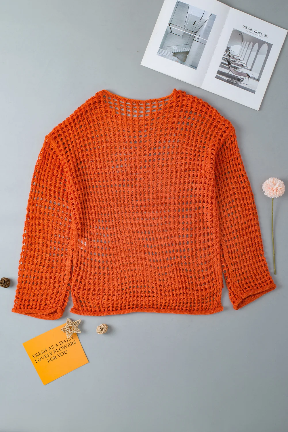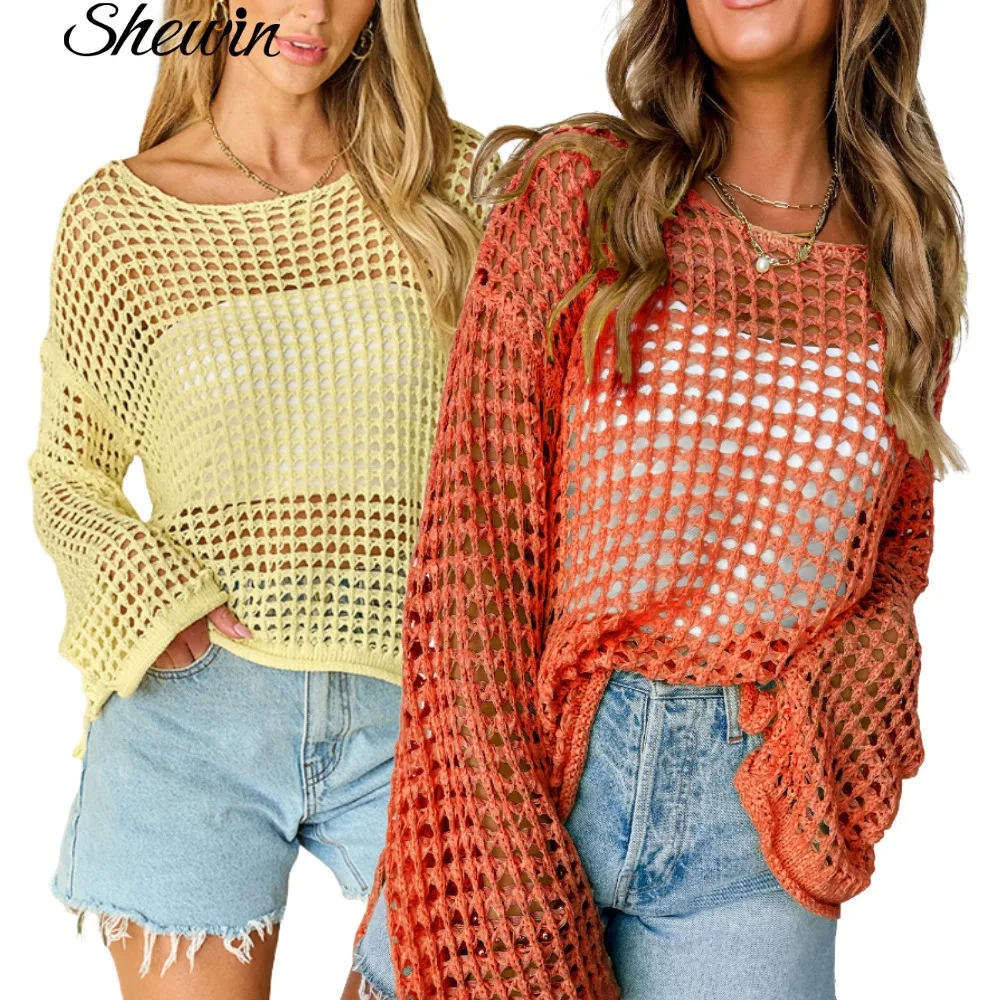 Shewin Fall Winter Chic Custom Logo Orange Open Knit Crochet Bell Sleeve Tunic Sweater Casual Boutique Clothes Wholesale New