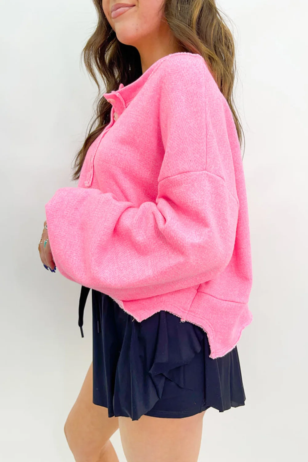 Shewin Boutique Women's 2026 Fall Pullover Sweatshirts Sachet Pink Plain Knit Drop Sleeve Henley Casual Printed Sequined for