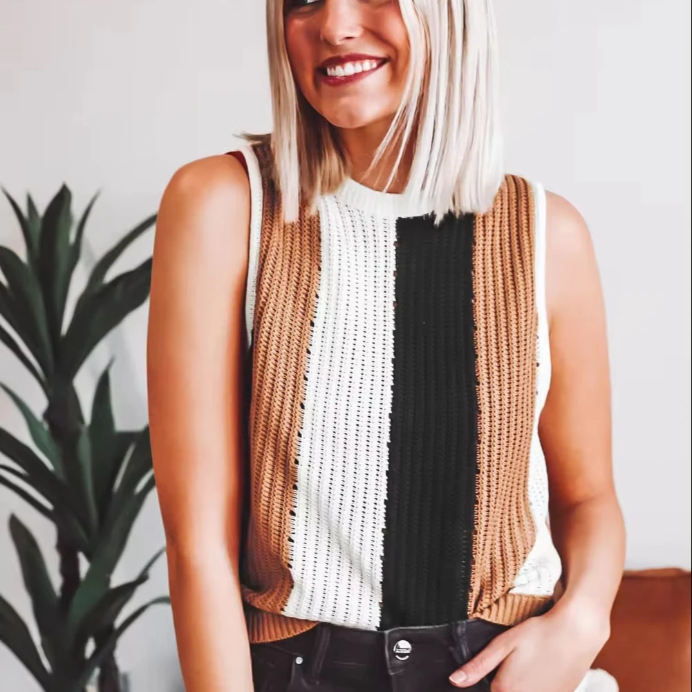 2026 Women's Casual Boutique Clothing Wholesale Khaki Stripe Color Block Sleeveless Knitted Sweater with Custom Logo