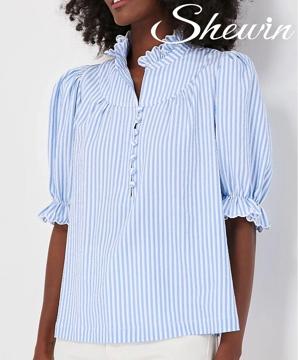Shewin 2026 Summer Women's Knit Tops Latest Design Ladies' Casual Striped Tops with Flutter Puff Sleeves Ruffled Collar Sky Blue